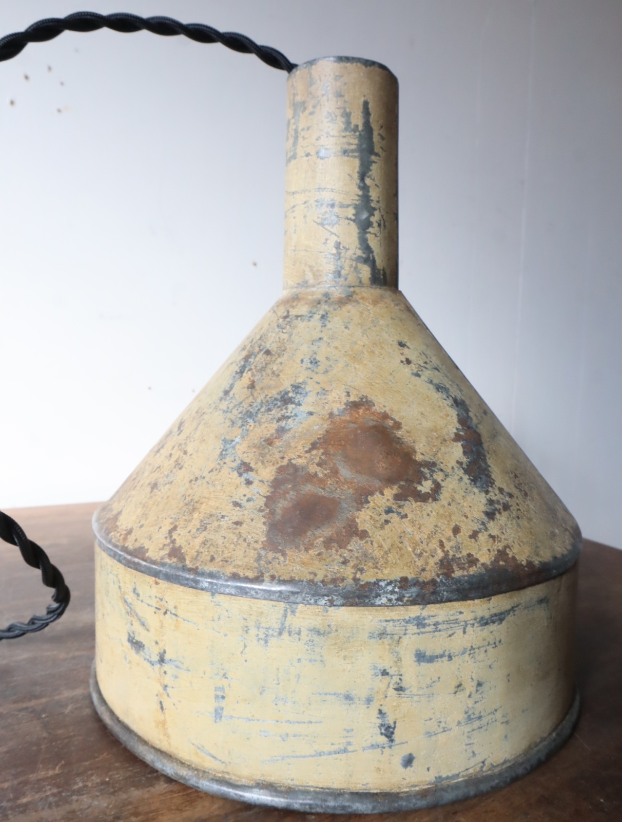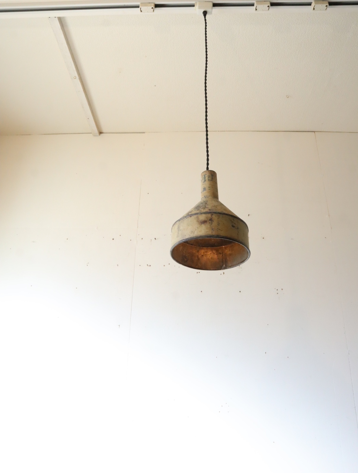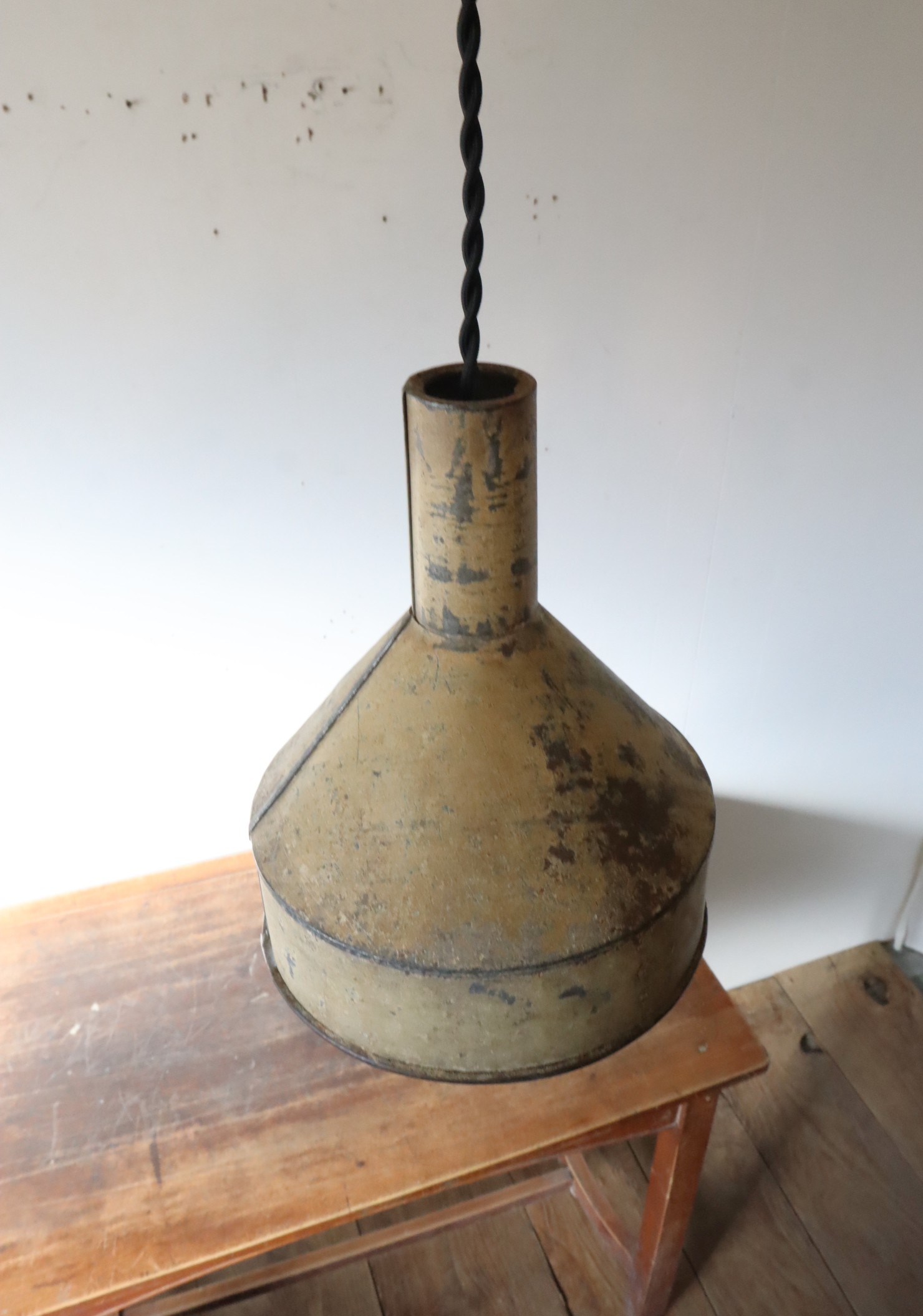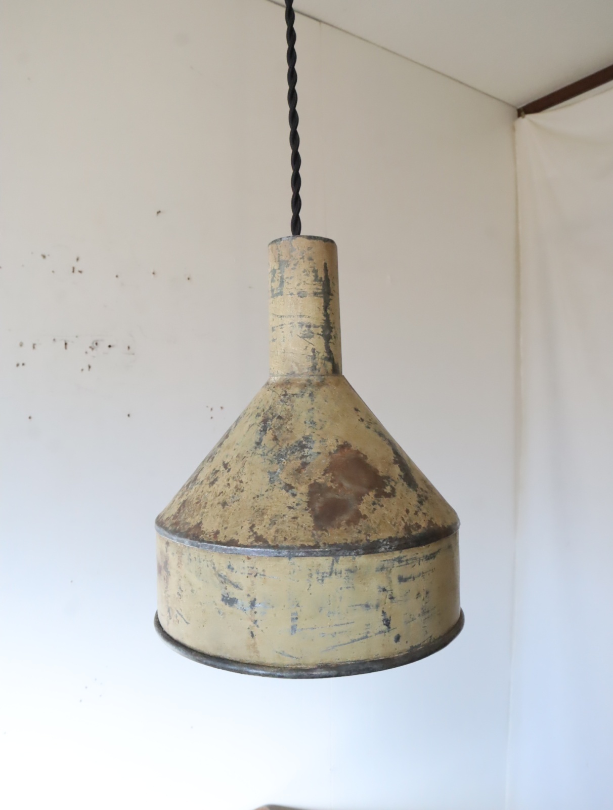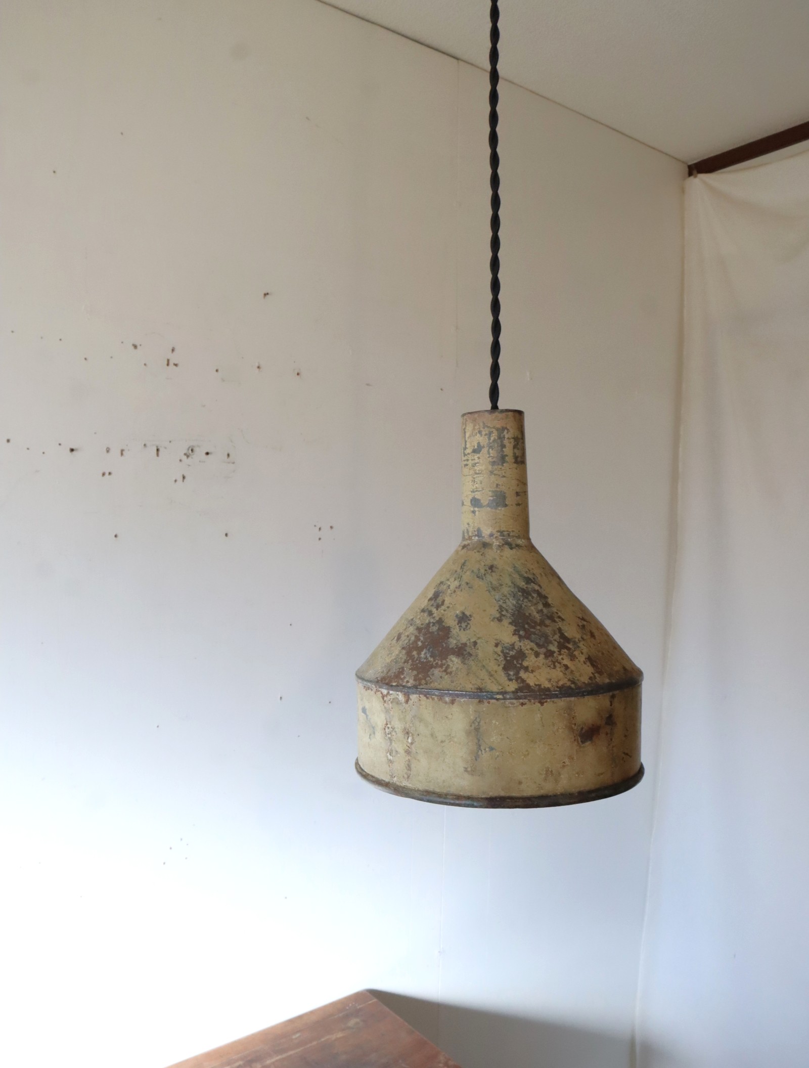 厚手のトタンで造られた古い漏斗を使ったペンダントライトになります。