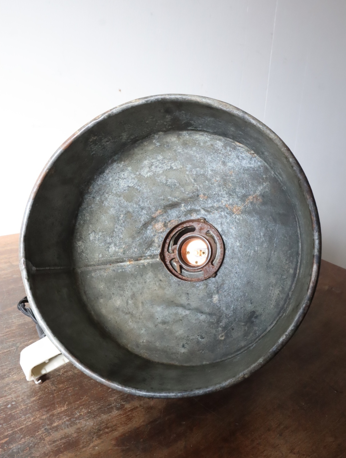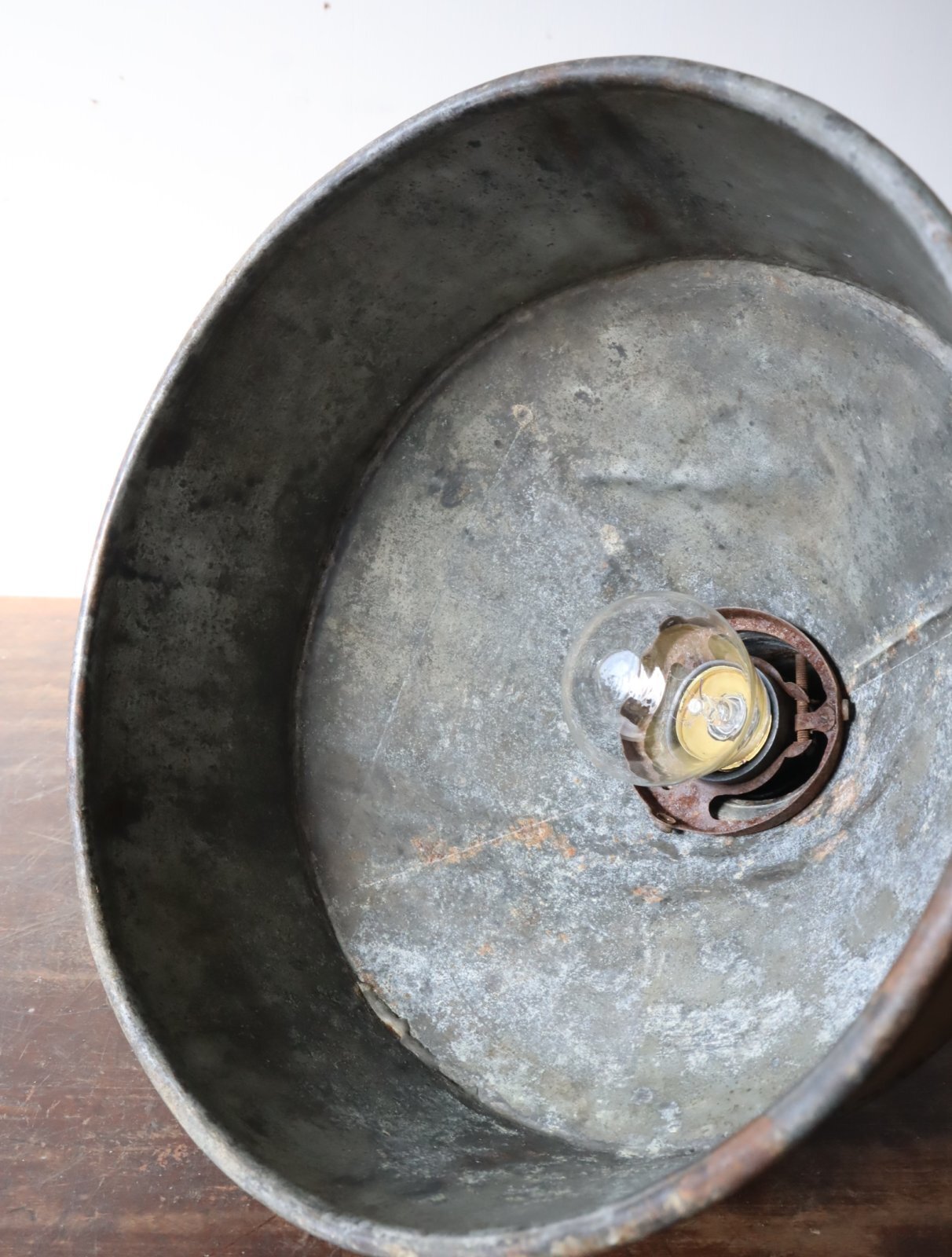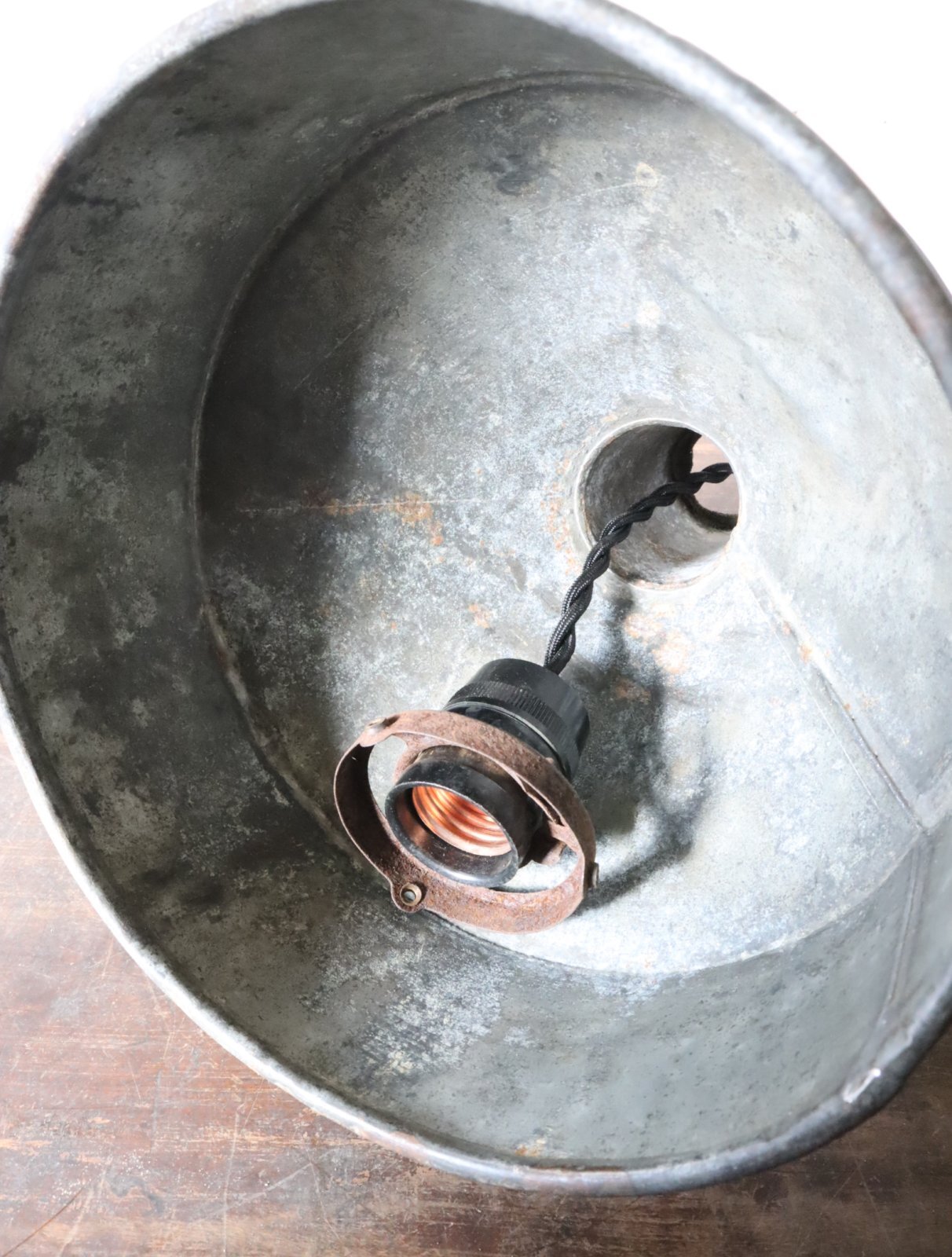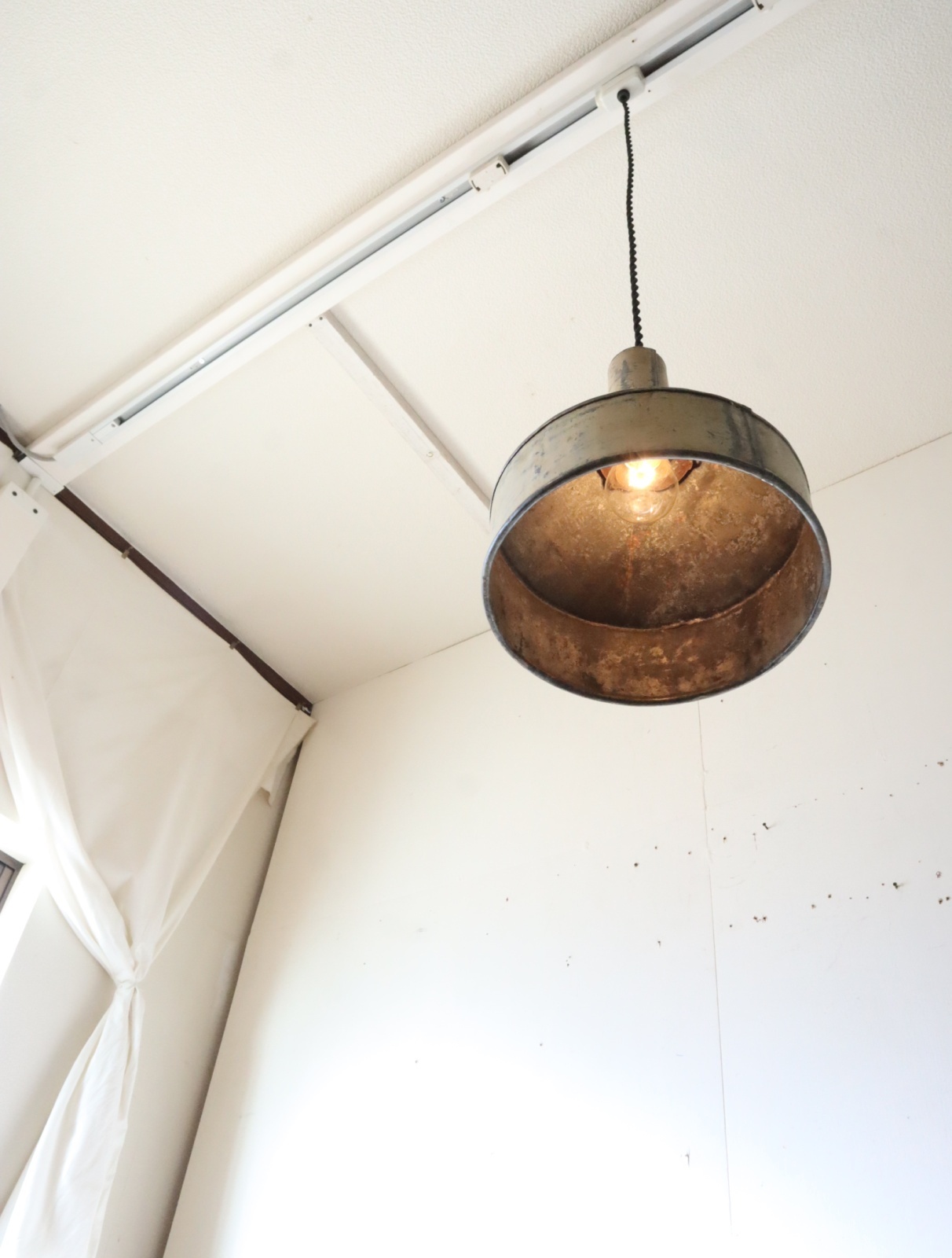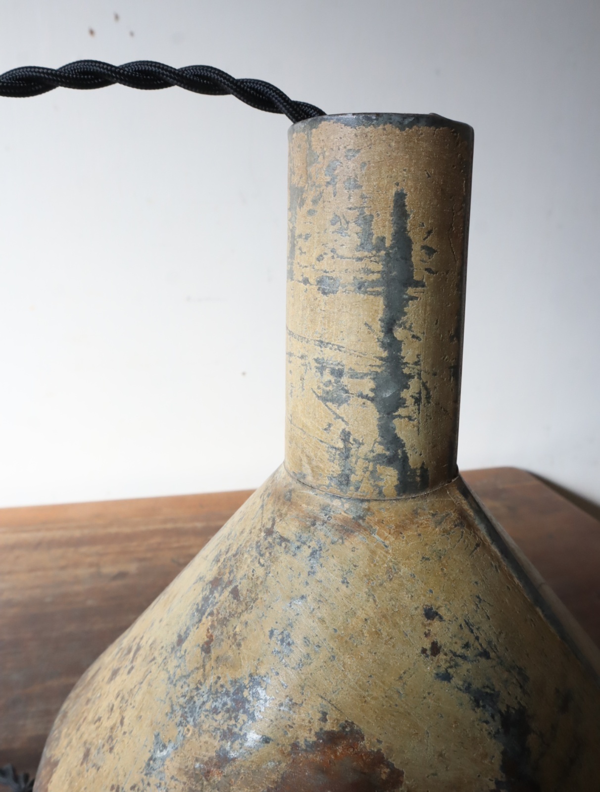 厚手のトタンで造られた古い漏斗を使ったペンダントライトになります。