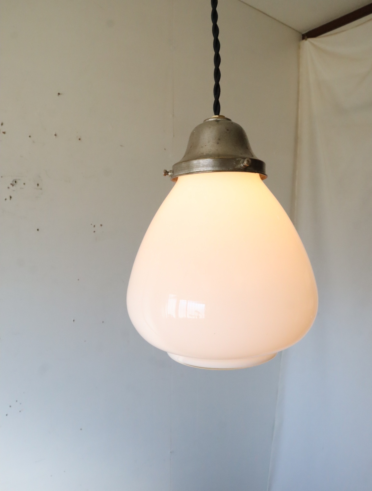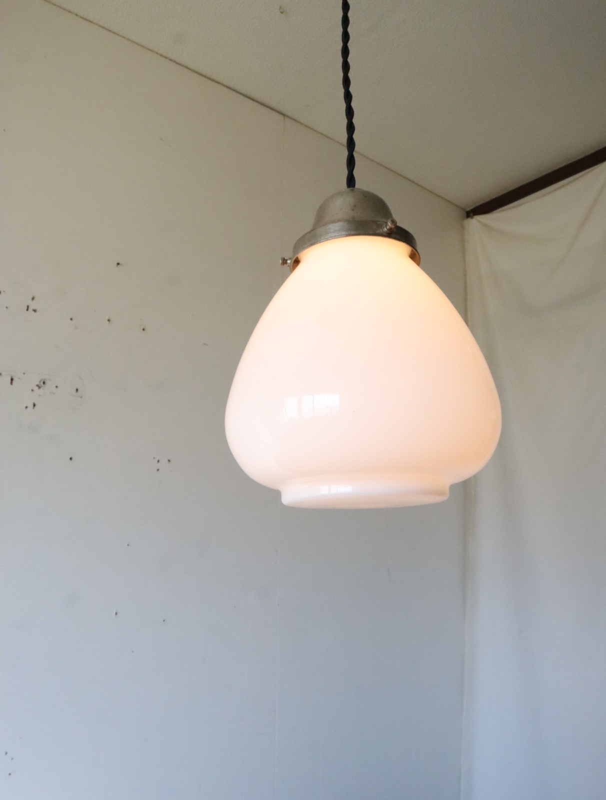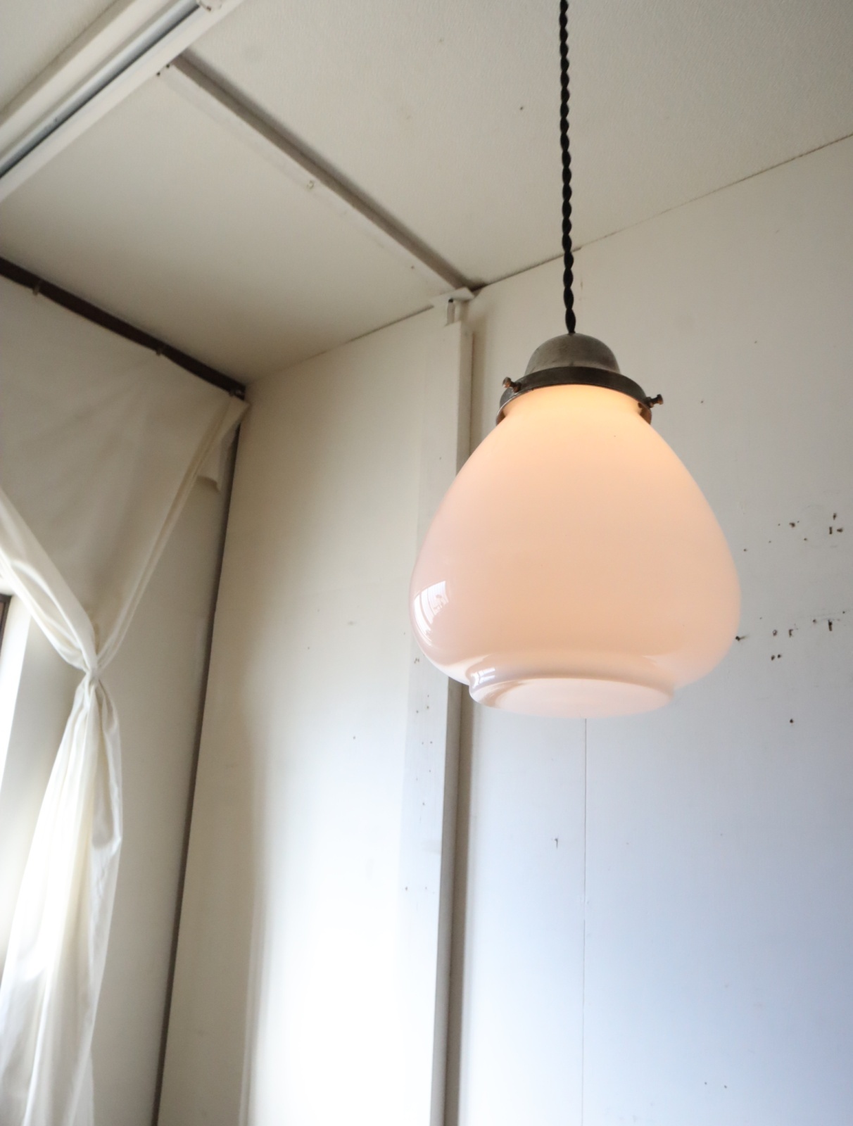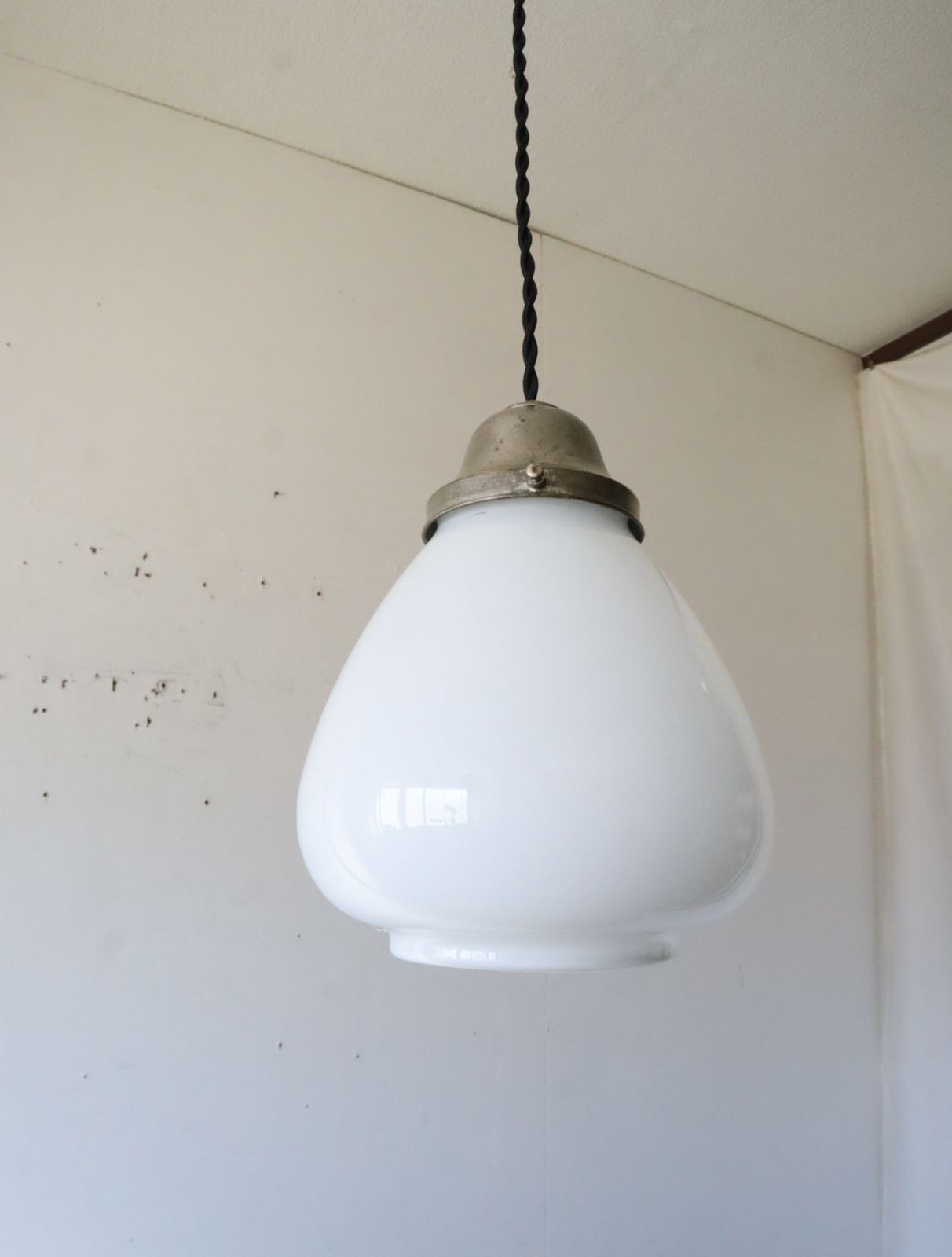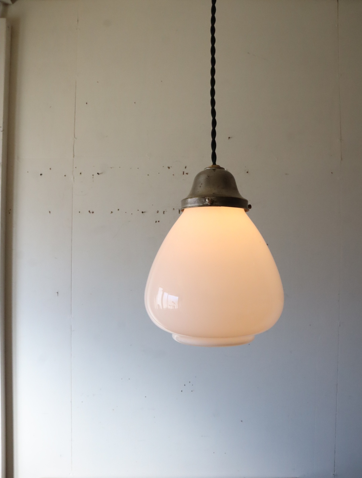 底面が平らで真ん中より下が膨らみ、上に行くにつれて窄まった球根のようなカタチをした古い乳白ガラスが付いたペンダントライトになります。
