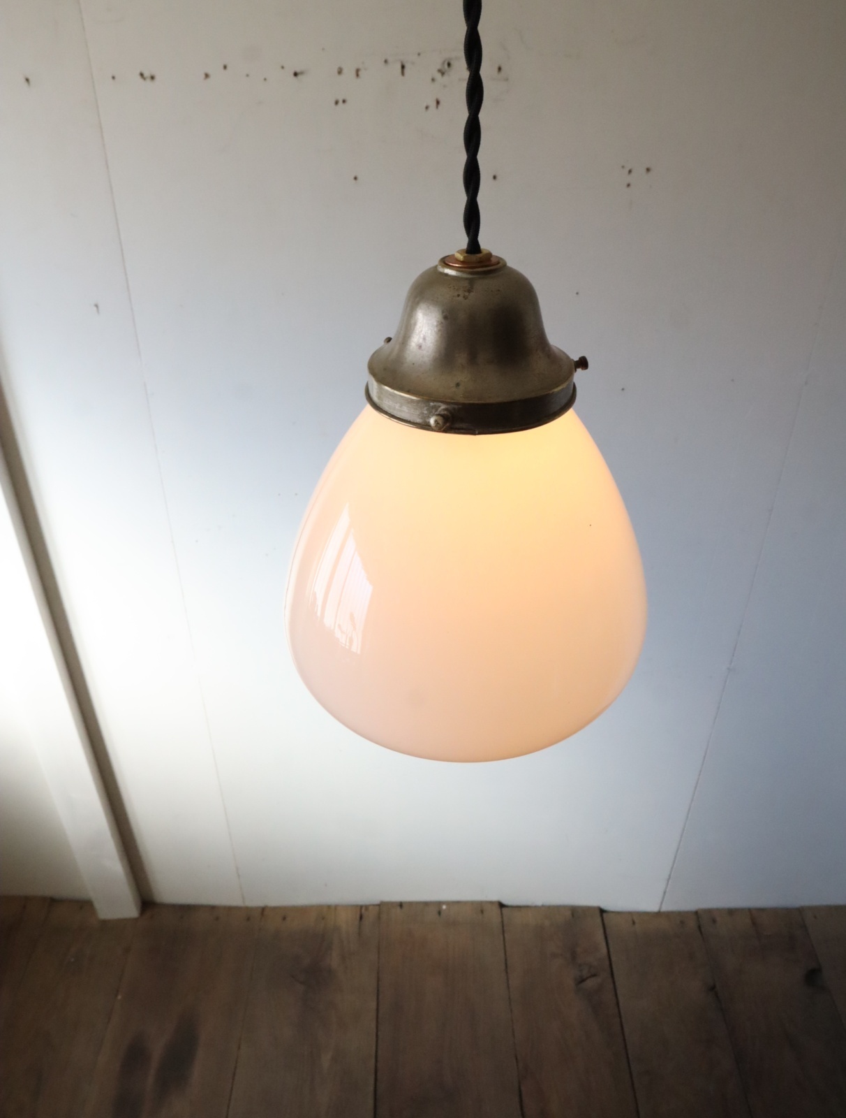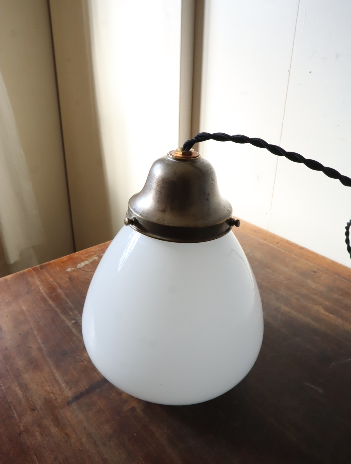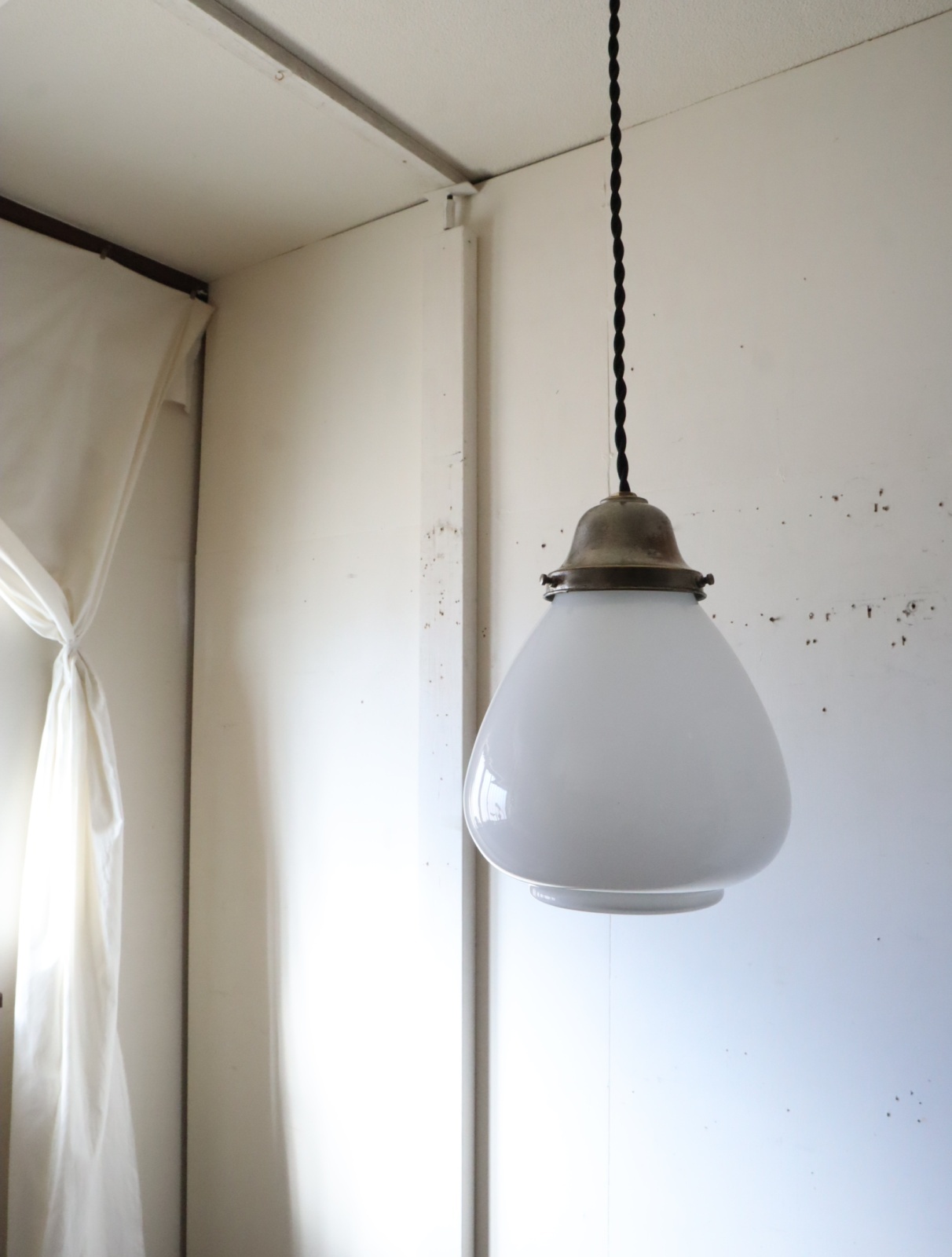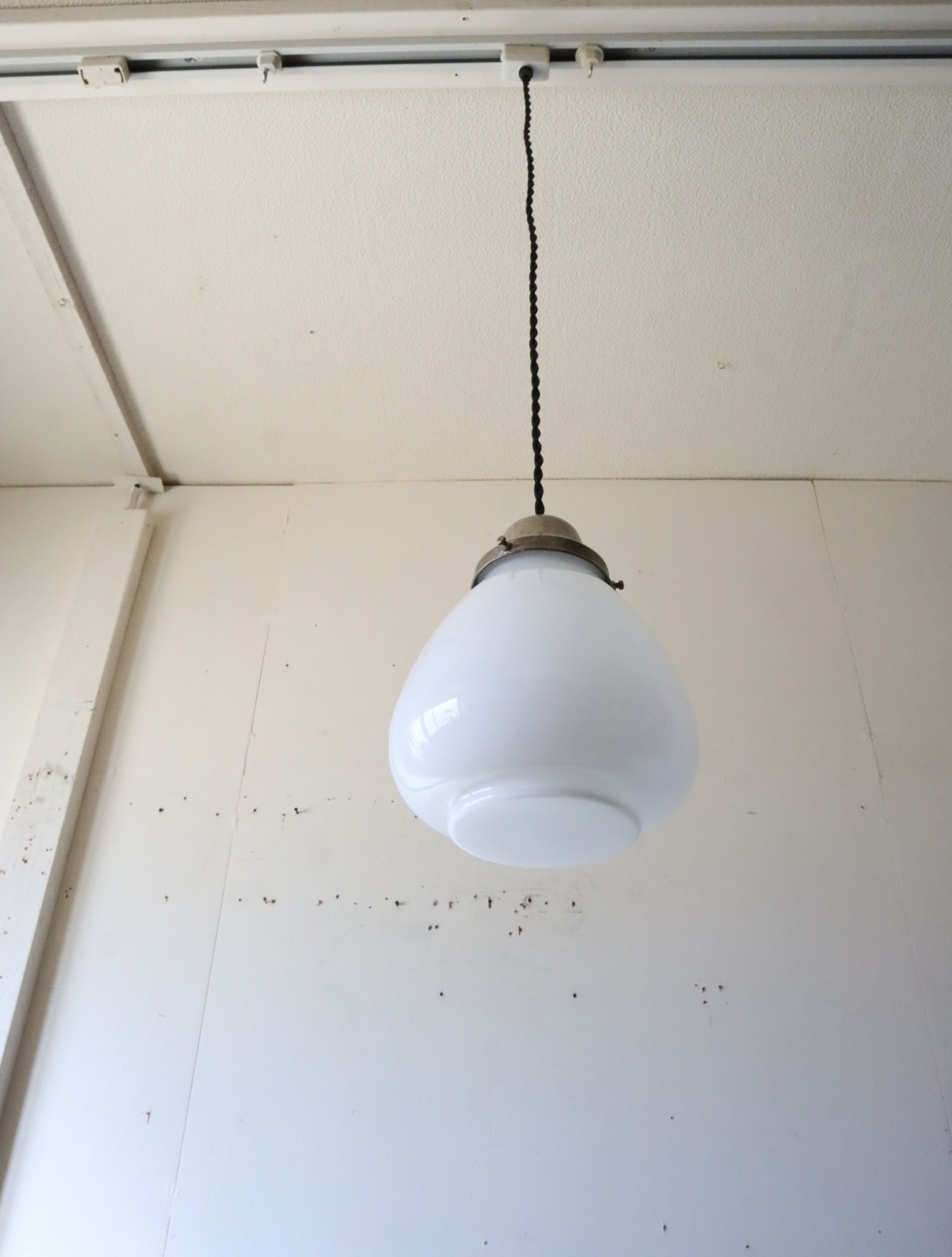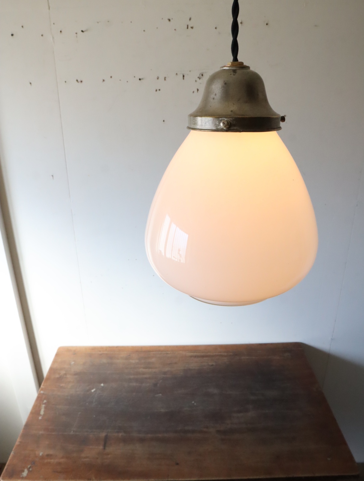 底面が平らで真ん中より下が膨らみ、上に行くにつれて窄まった球根のようなカタチをした古い乳白ガラスが付いたペンダントライトになります。