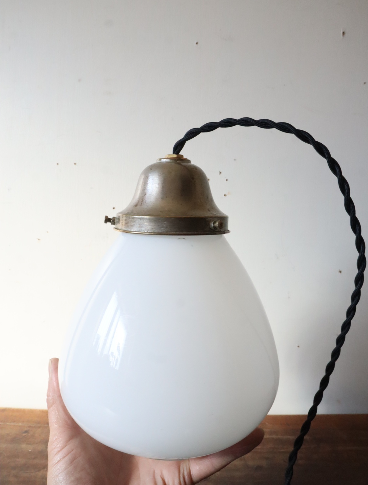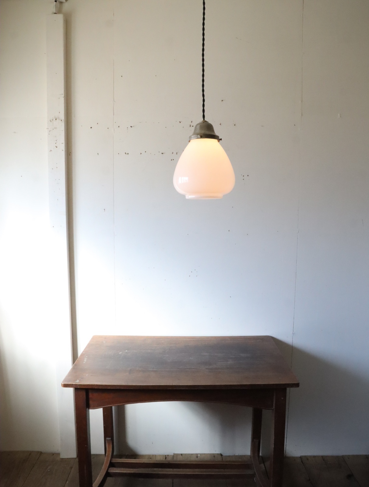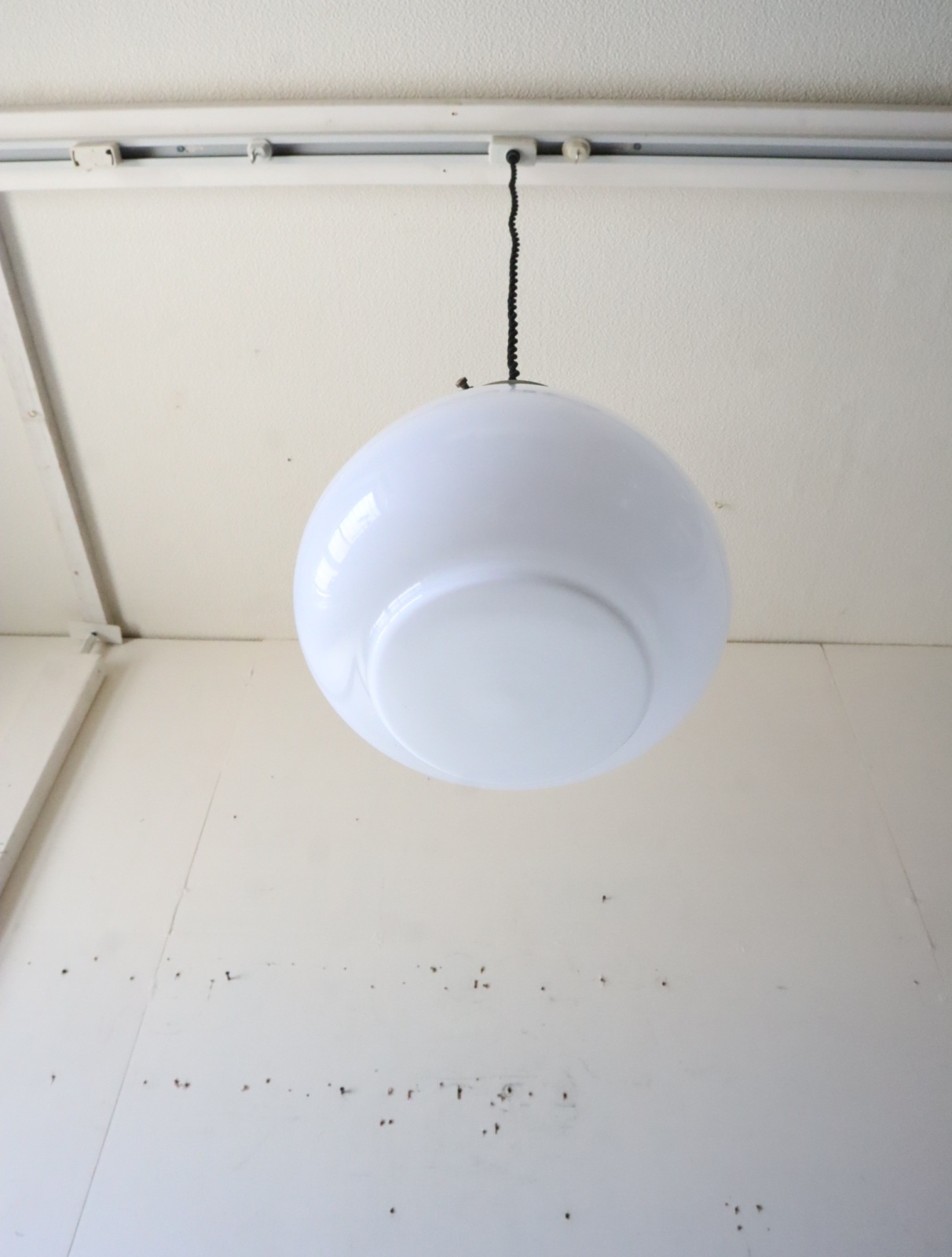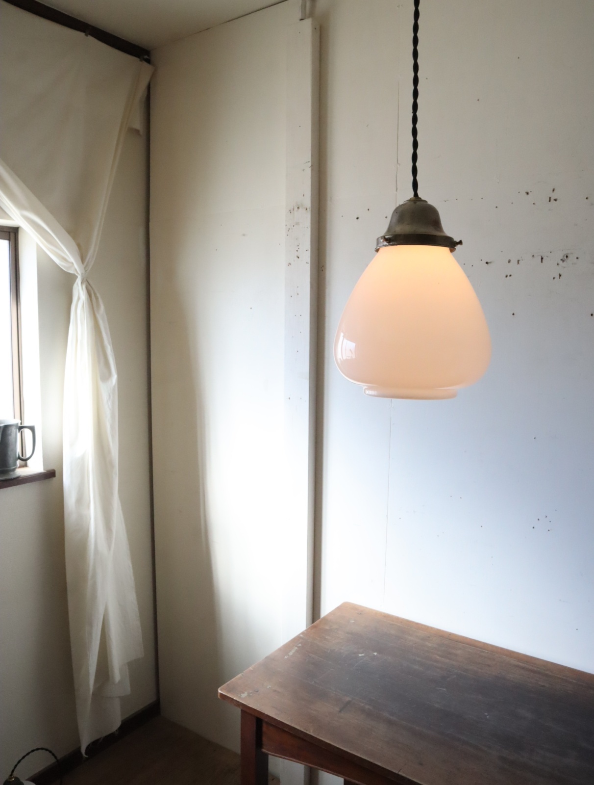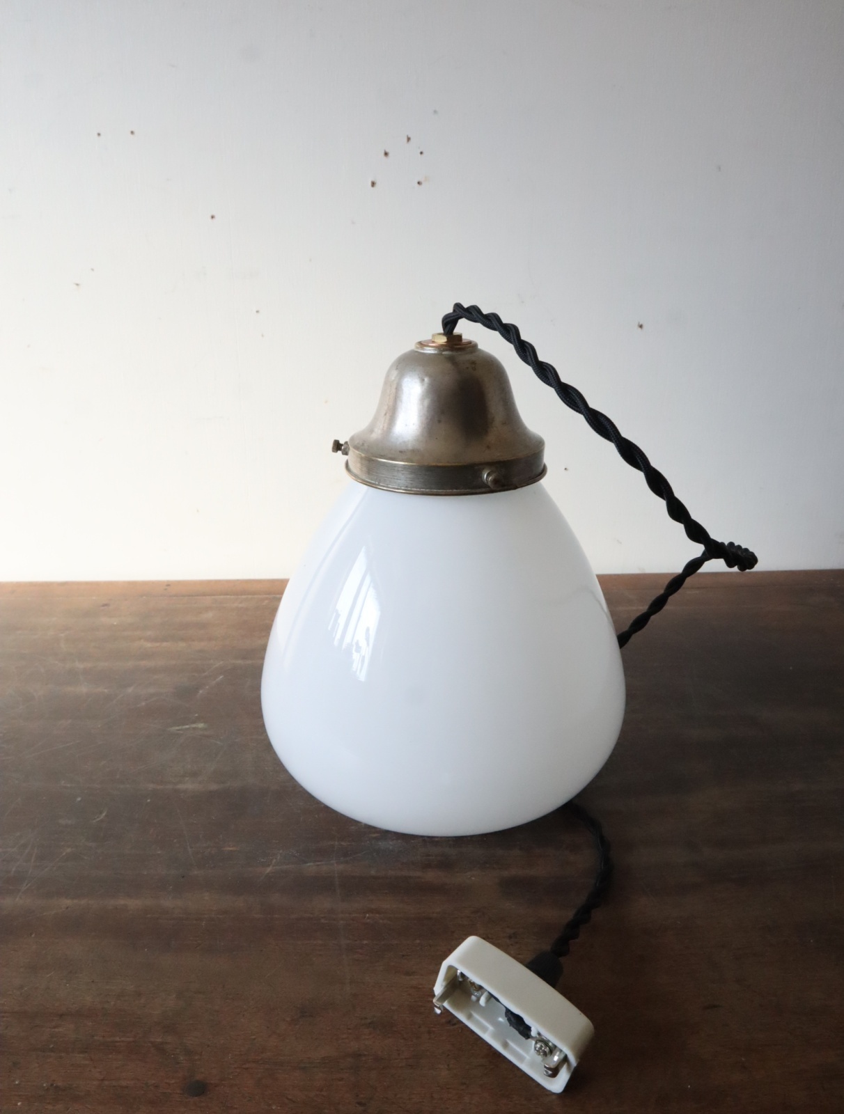 底面が平らで真ん中より下が膨らみ、上に行くにつれて窄まった球根のようなカタチをした古い乳白ガラスが付いたペンダントライトになります。