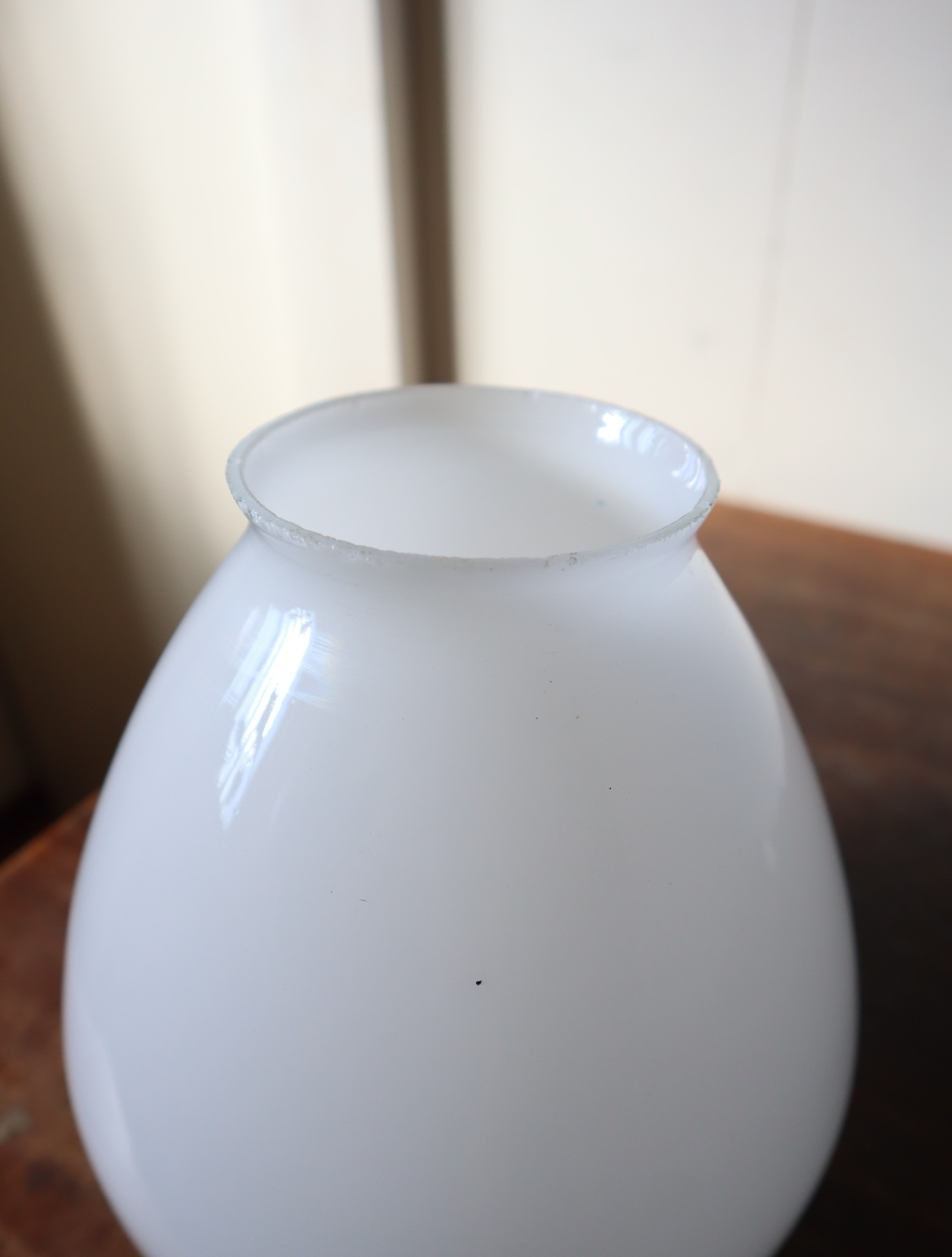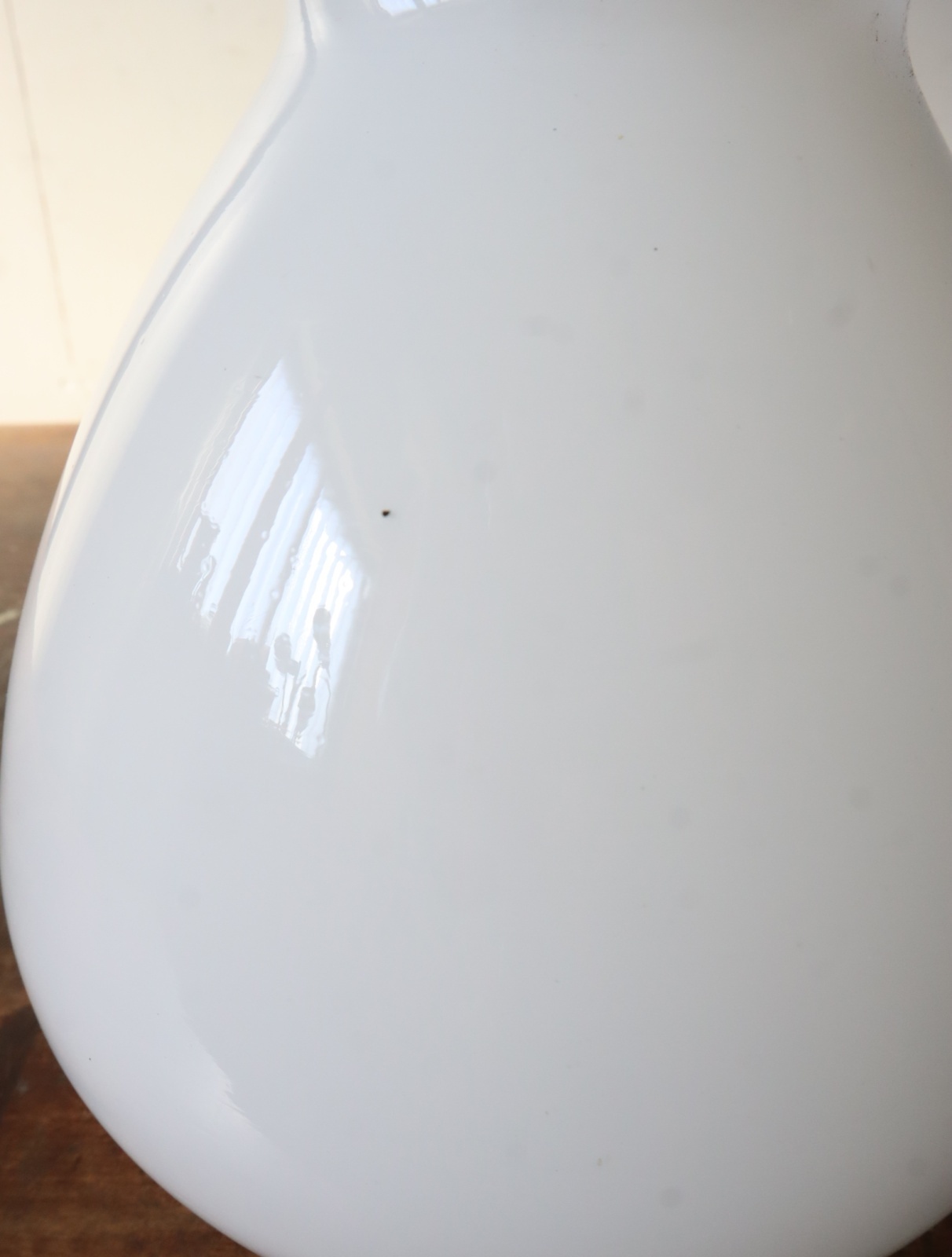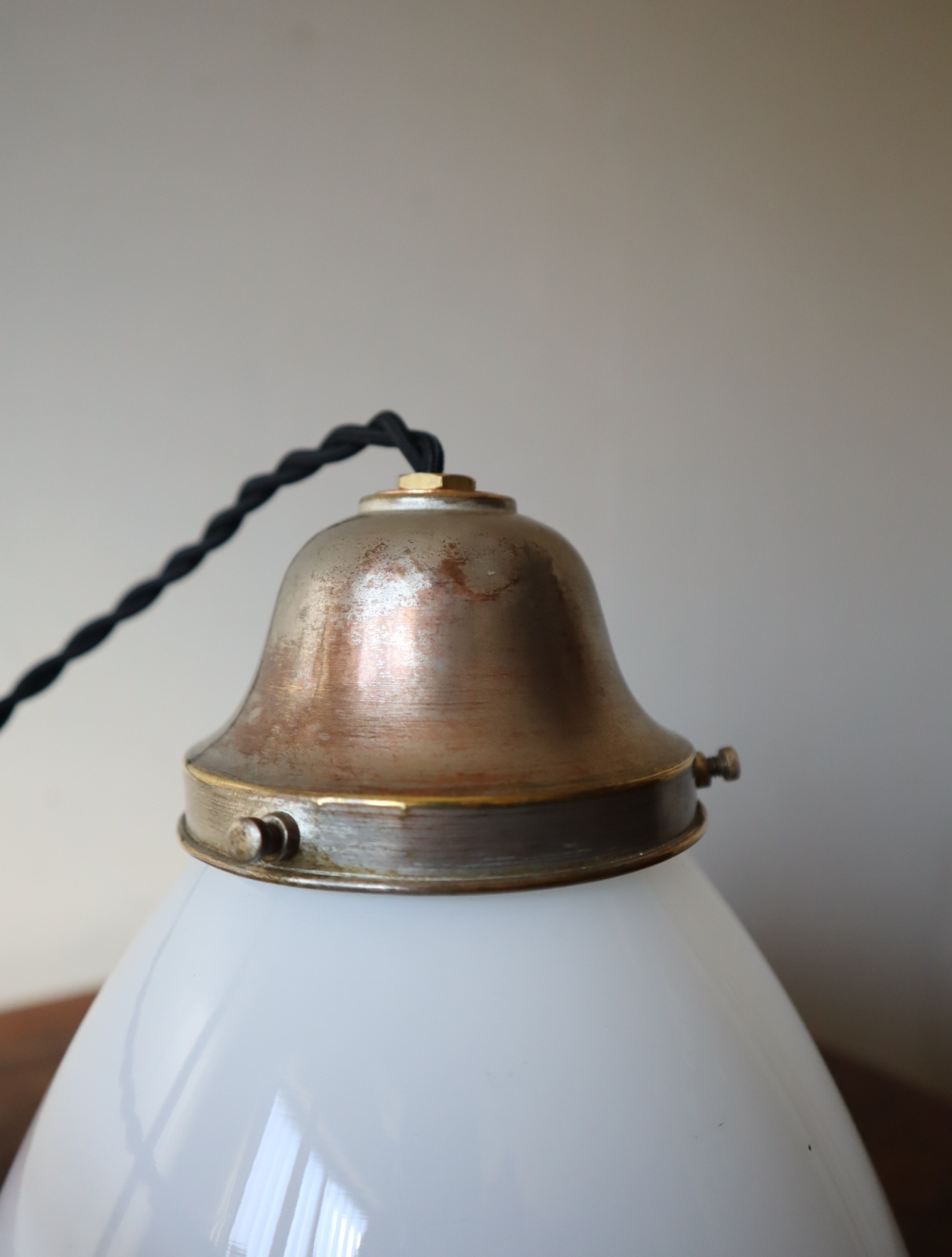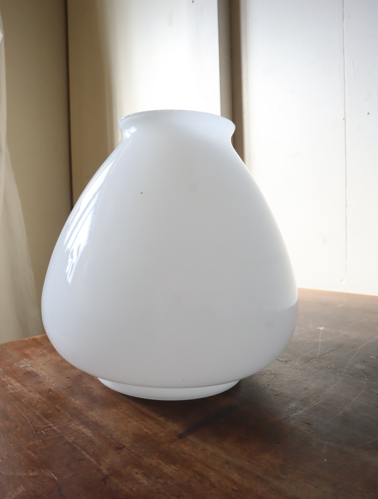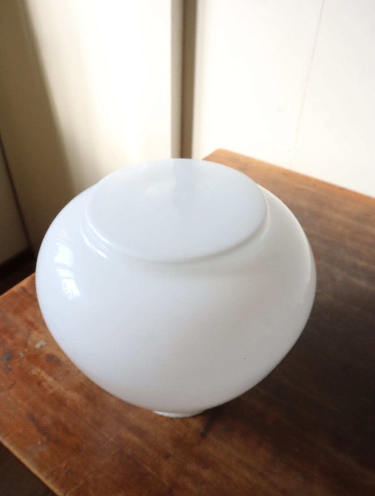 底面が平らで真ん中より下が膨らみ、上に行くにつれて窄まった球根のようなカタチをした古い乳白ガラスが付いたペンダントライトになります。