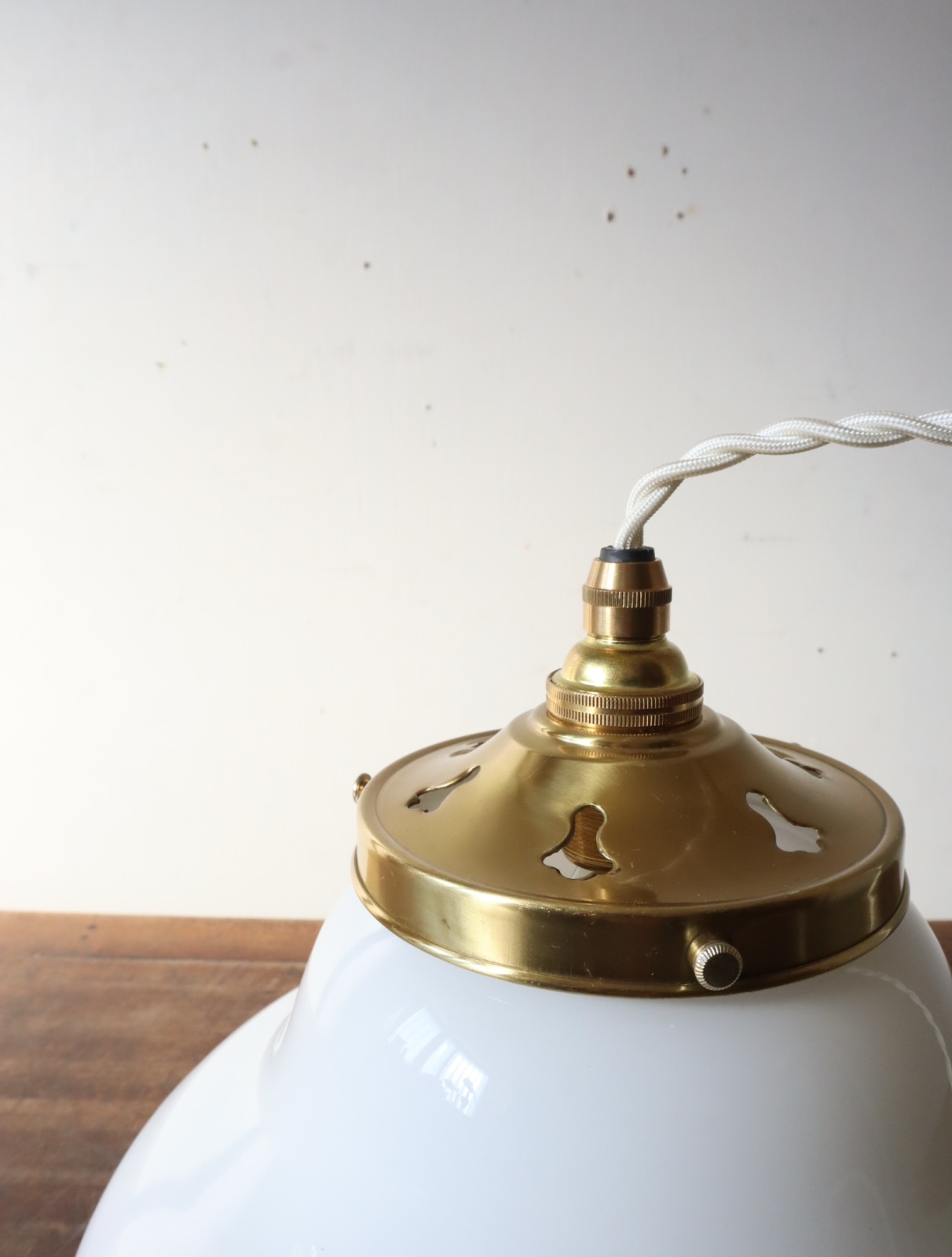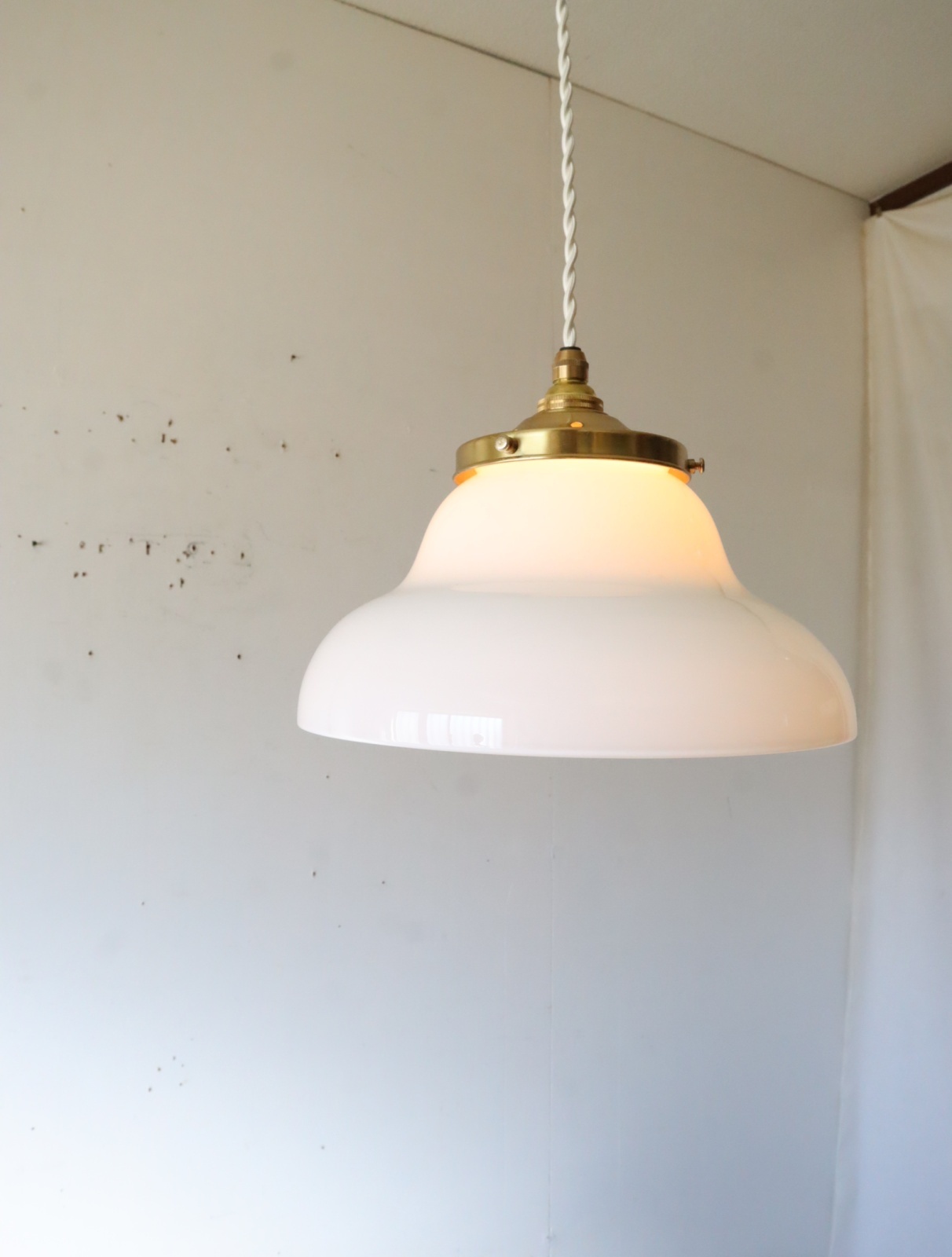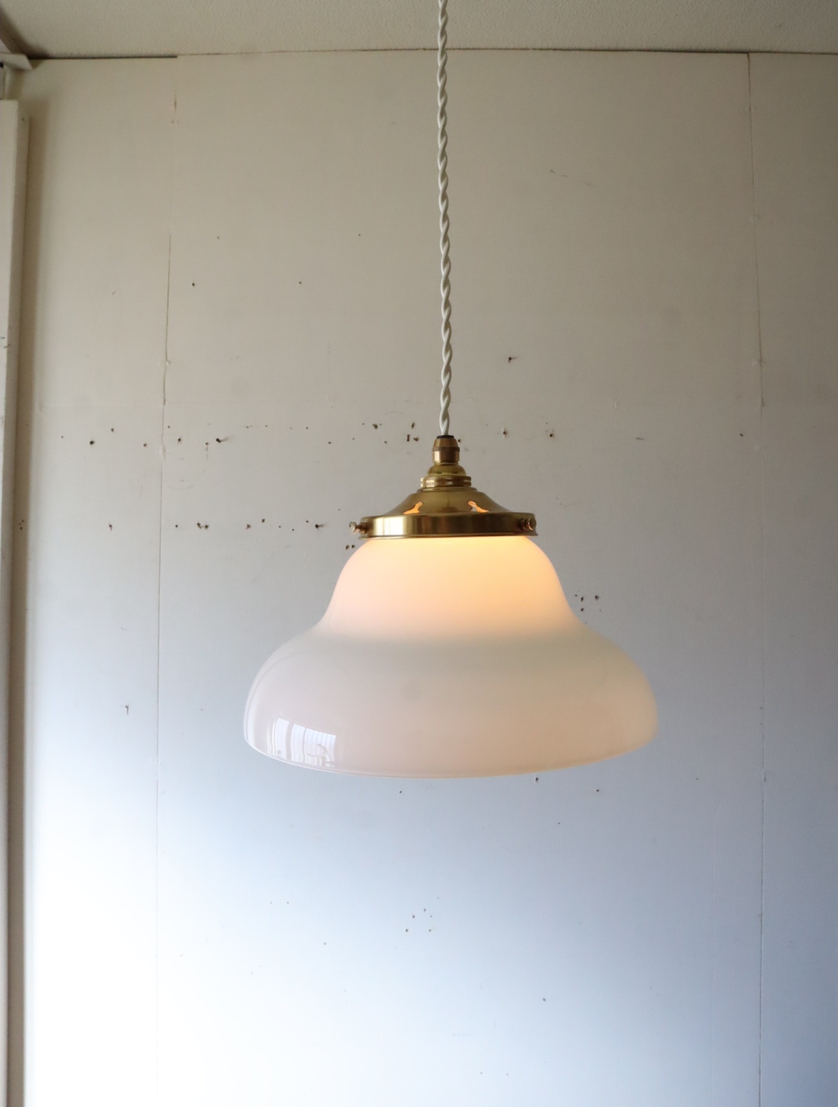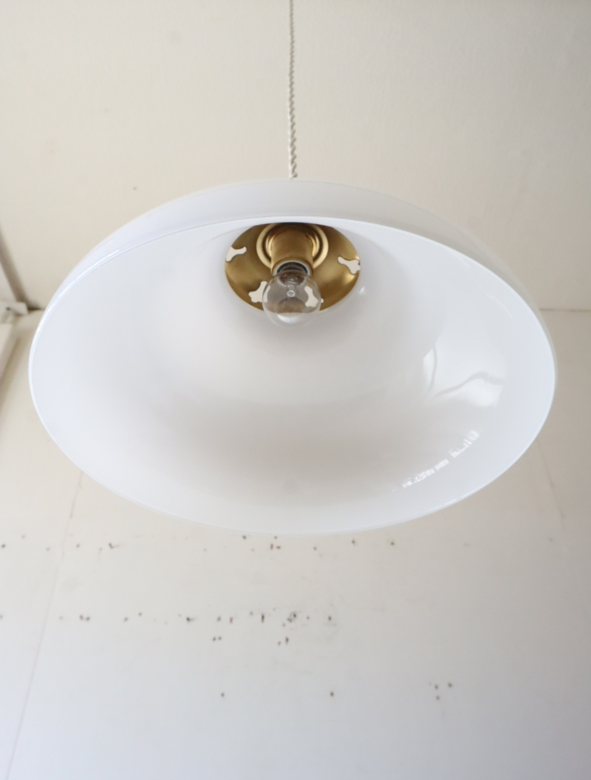 丸みのあるやわらかいフォルムの円盤型をした古い乳白ガラスのシェードを取り付けたペンダントライトになります。