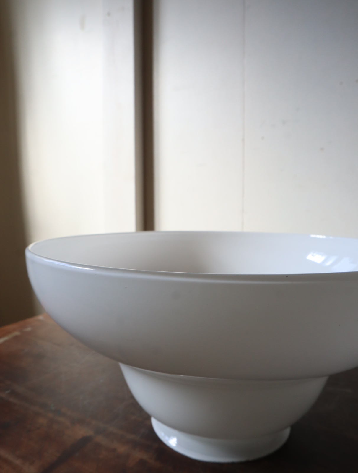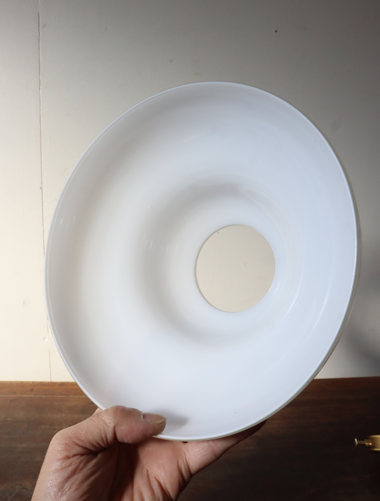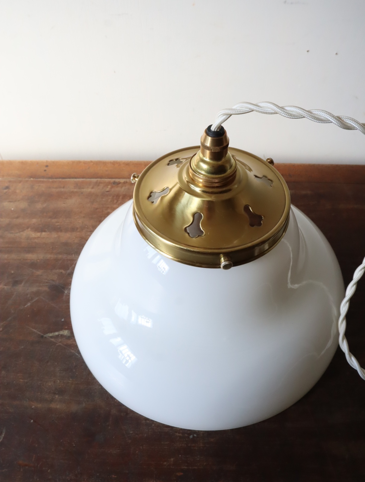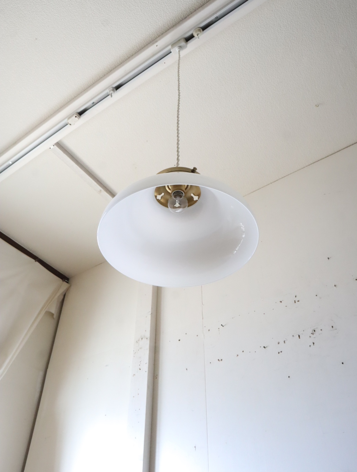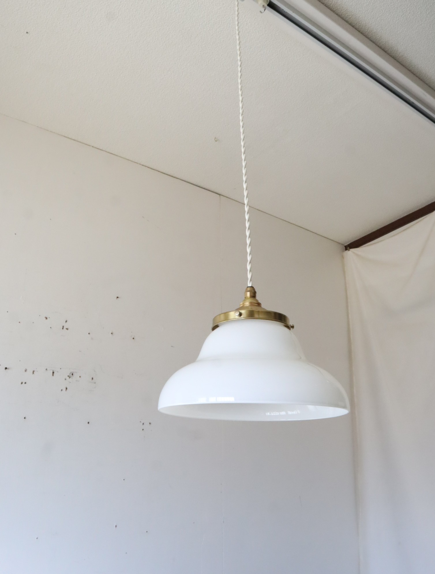 丸みのあるやわらかいフォルムの円盤型をした古い乳白ガラスのシェードを取り付けたペンダントライトになります。