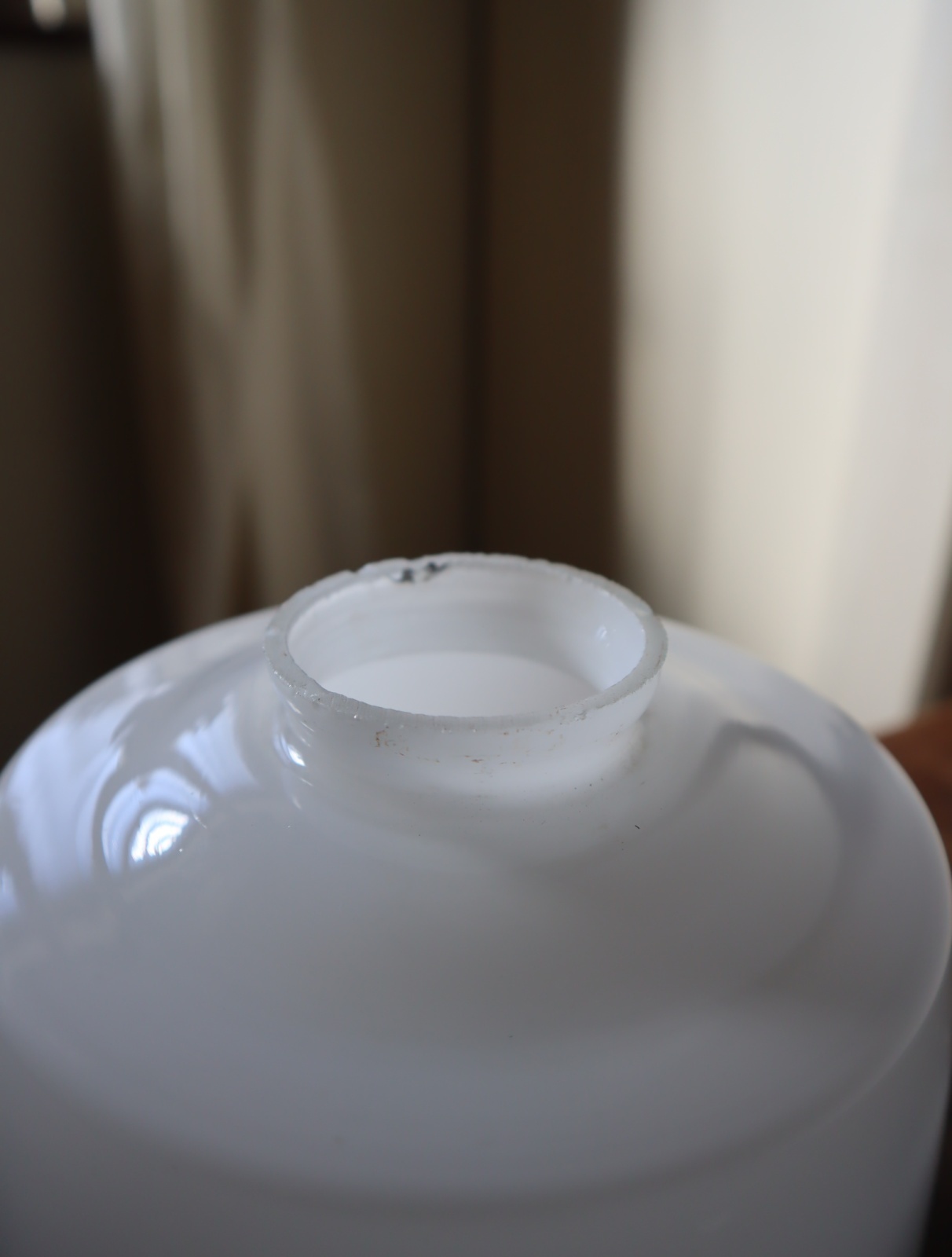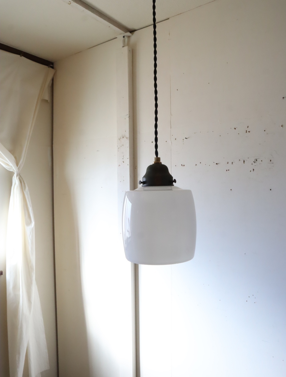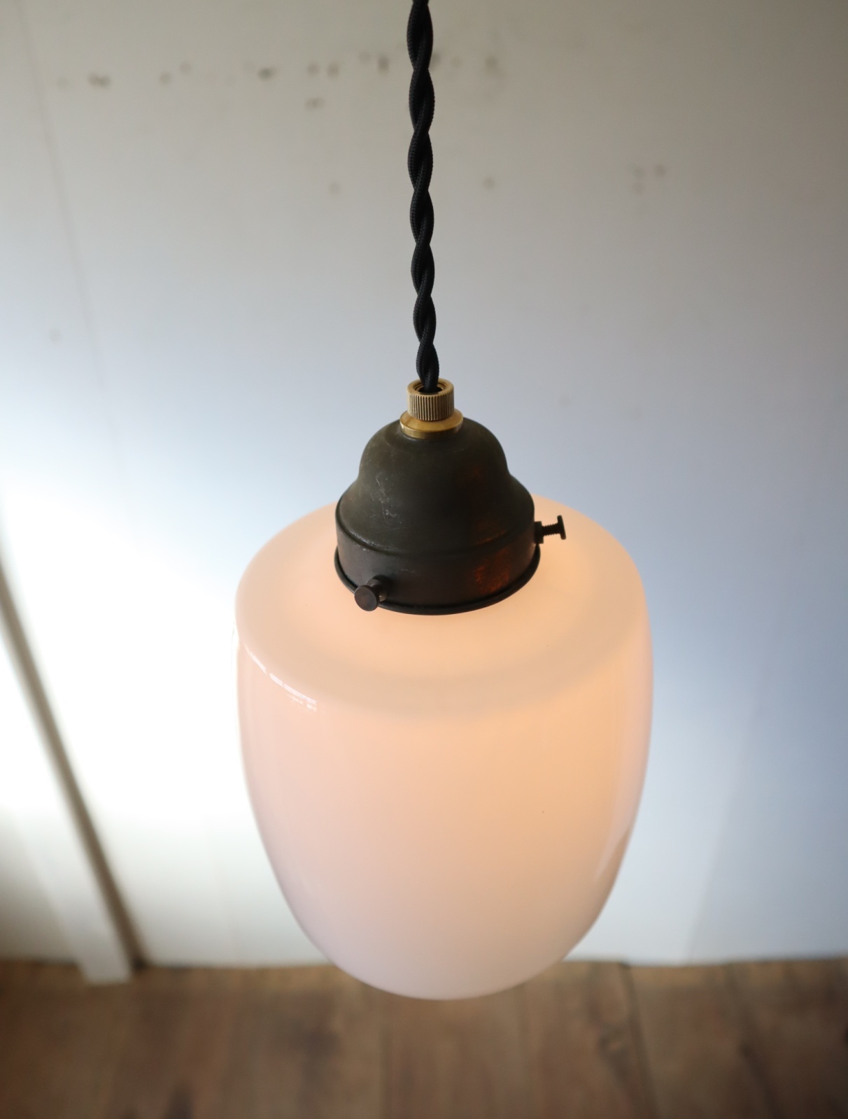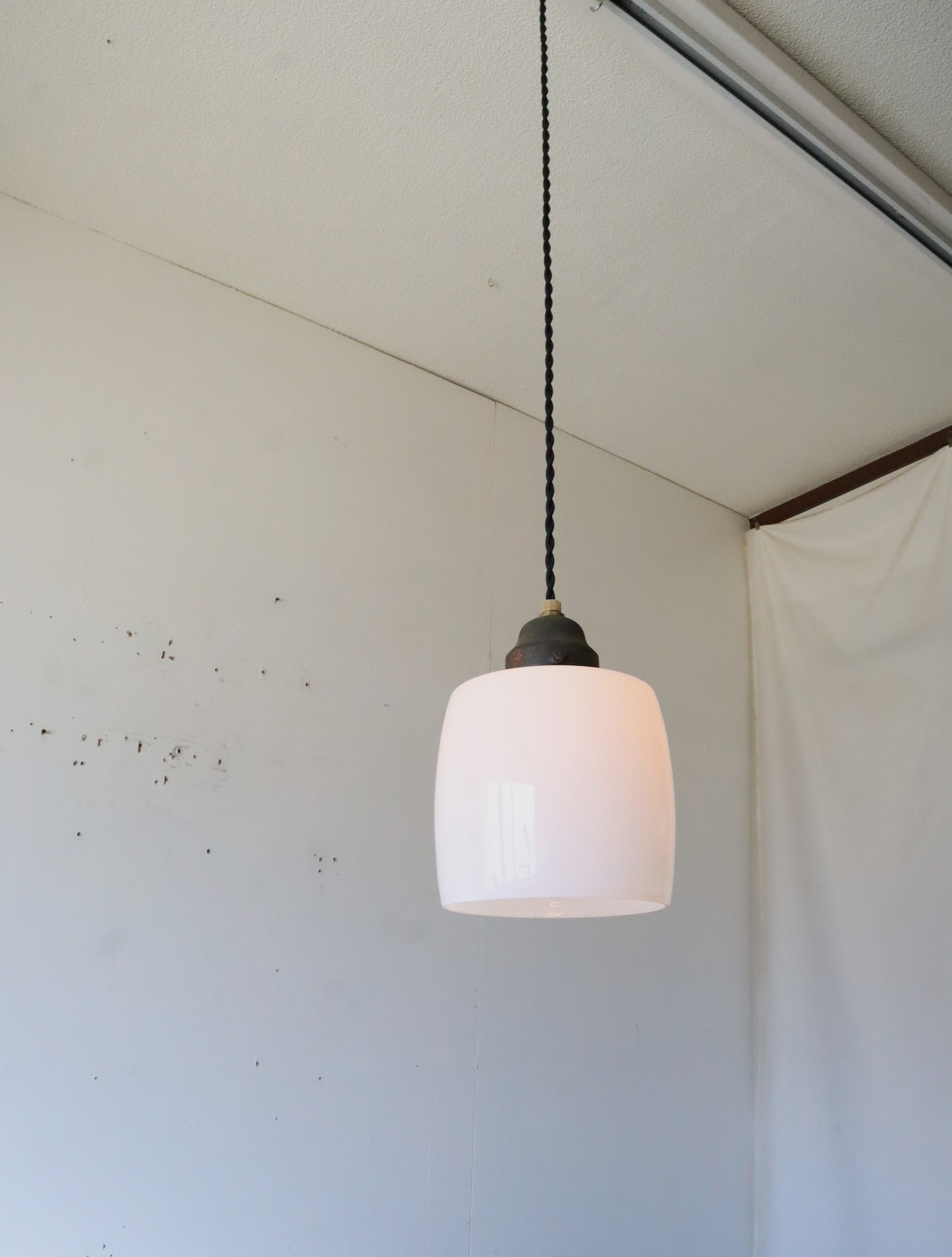 胴の部分がやや膨らみのある樽のようなカタチをした古い乳白ガラスが付いたペンダントライトになります。