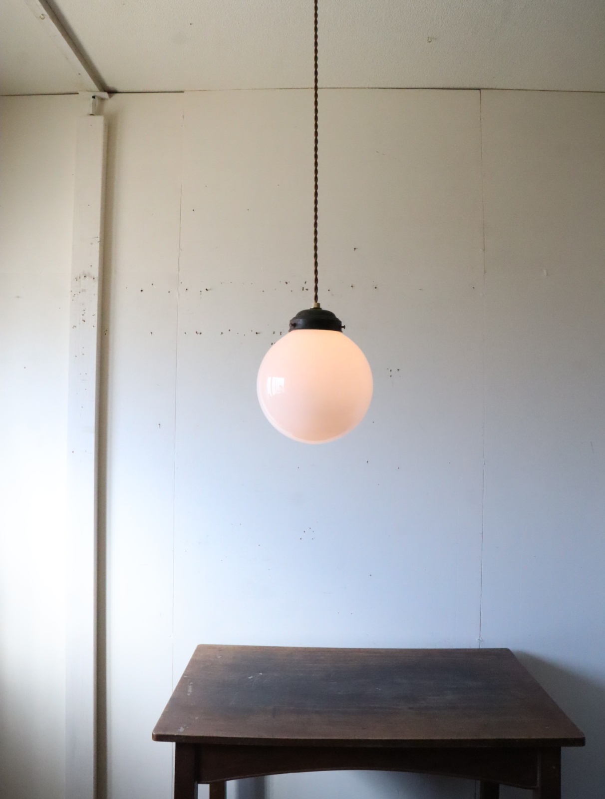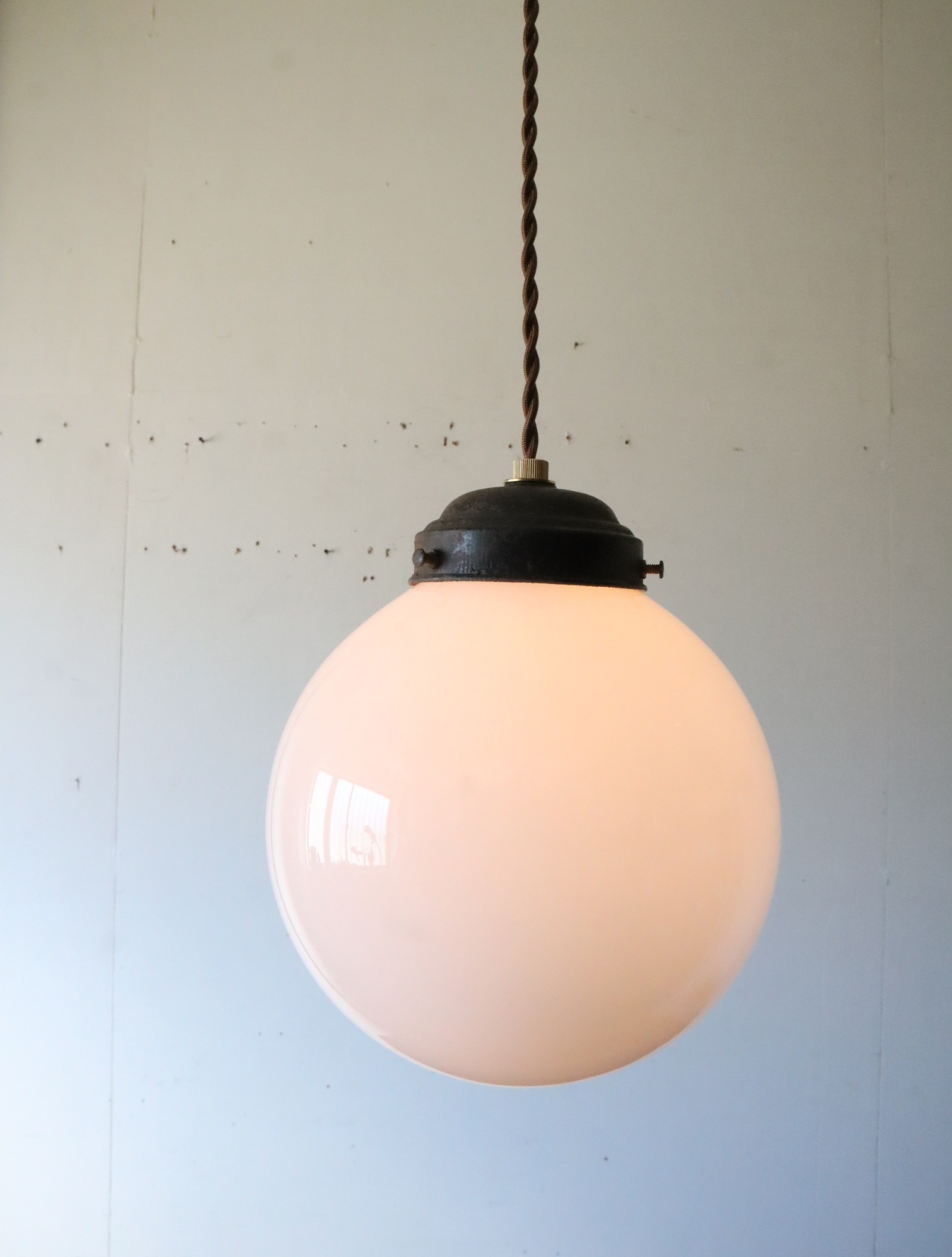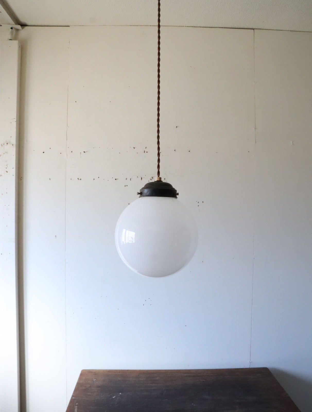 直径20cmの少し大きなサイズの丸型の古い乳白ガラスグローブが付いたペンダントライトになります。