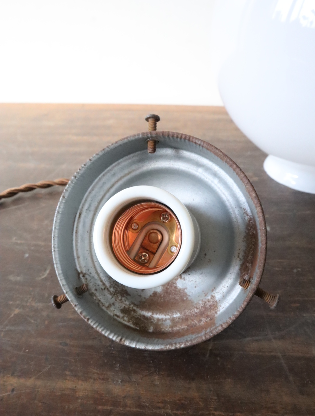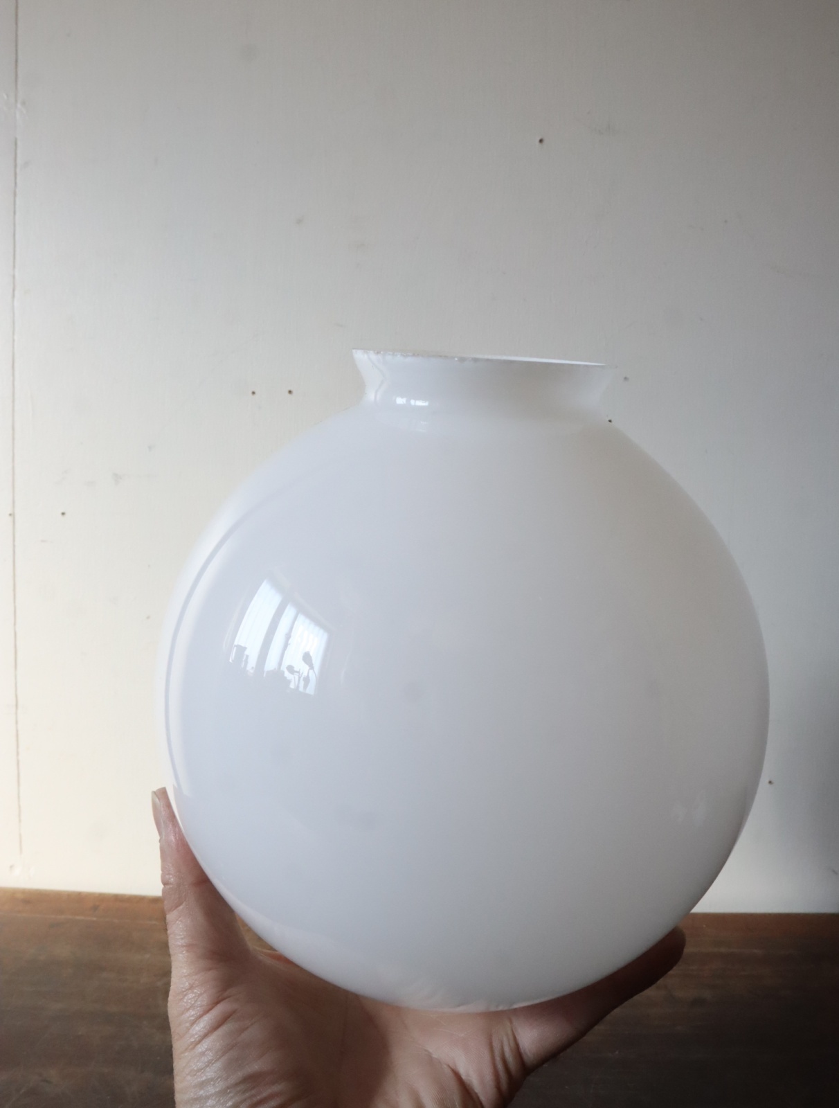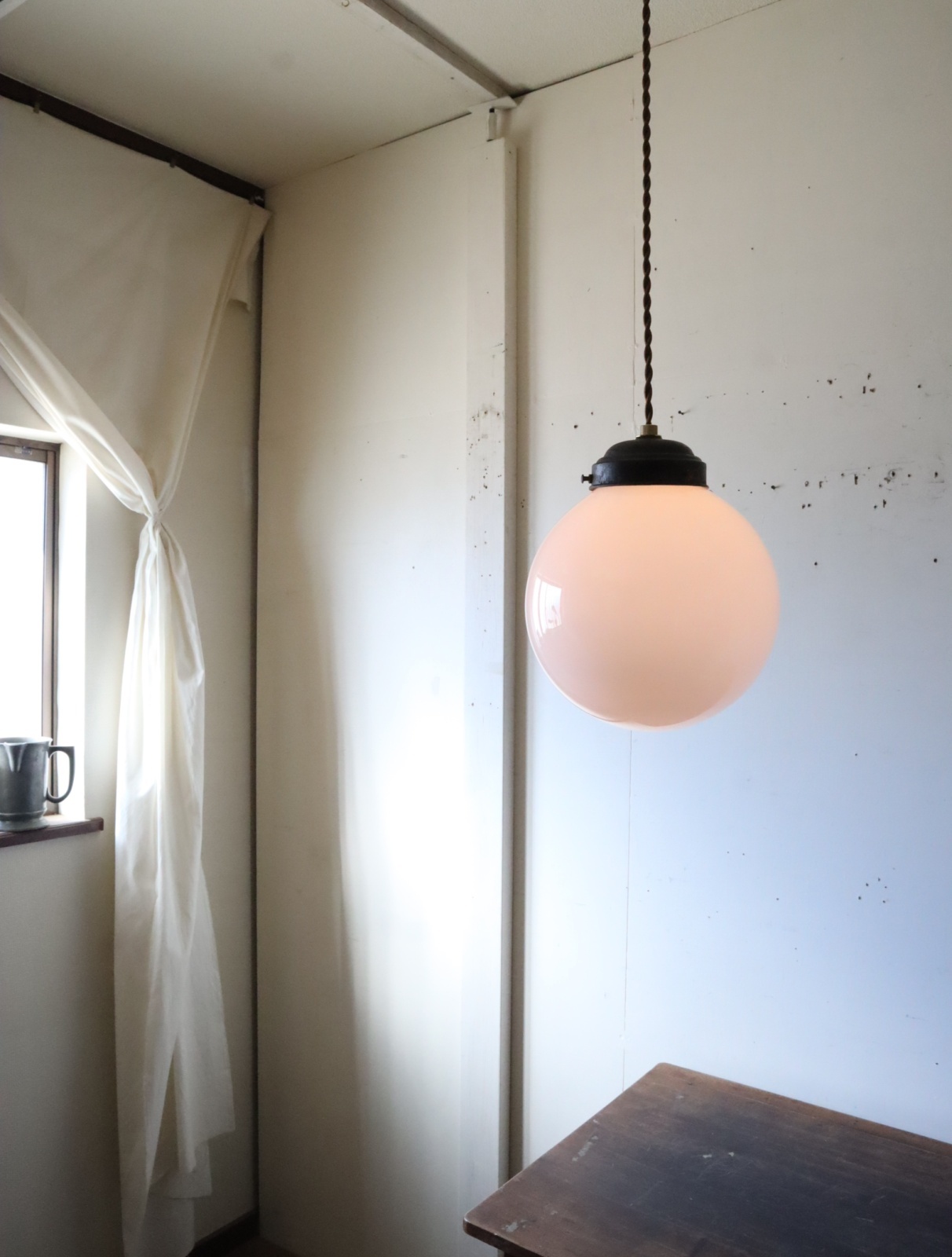 直径20cmの少し大きなサイズの丸型の古い乳白ガラスグローブが付いたペンダントライトになります。