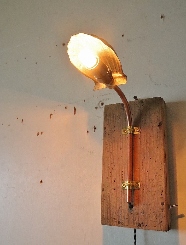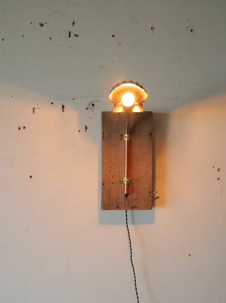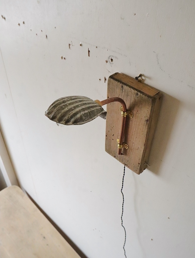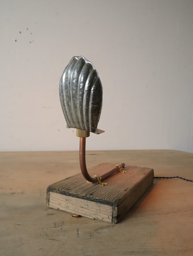 活版印刷所で使われていた文選箱とフランスのブリキ製のマドレーヌ型を組み合わせて壁掛けライトに仕立てました。