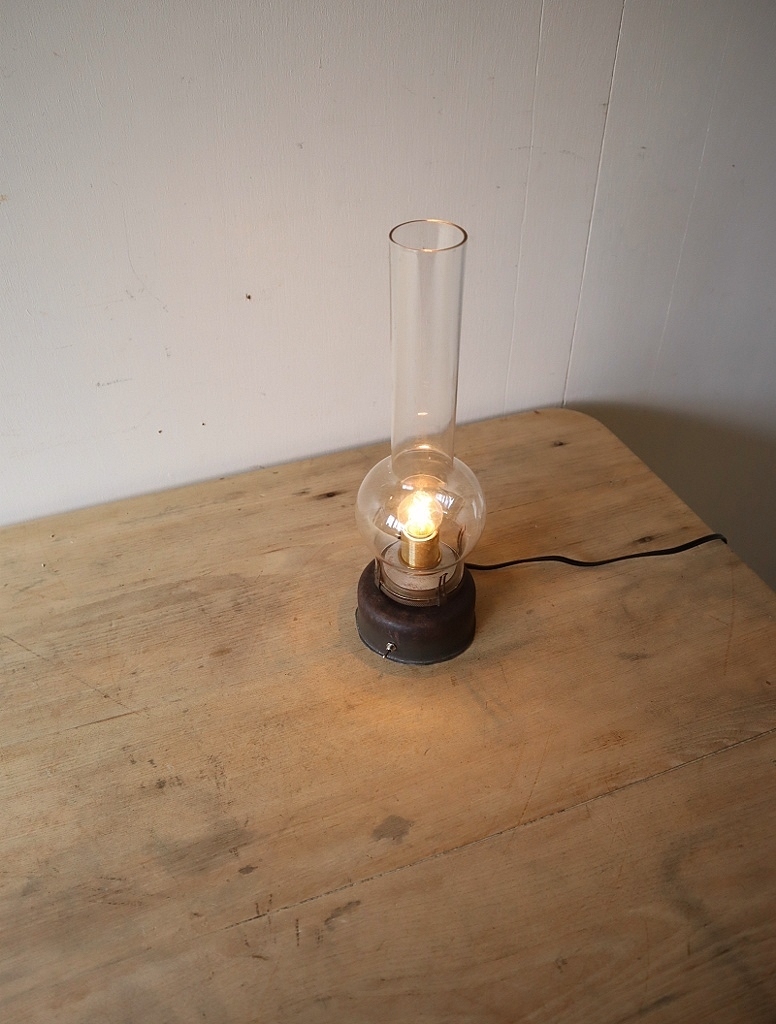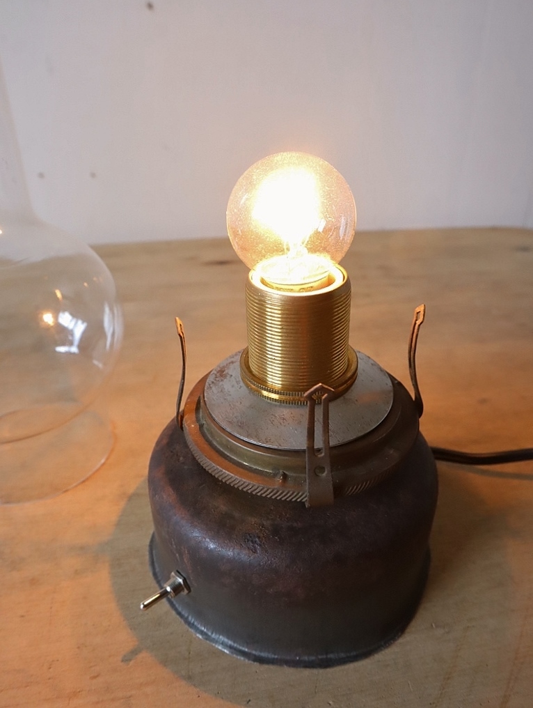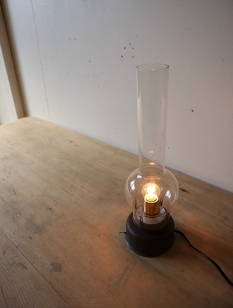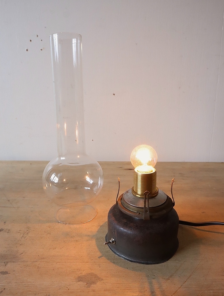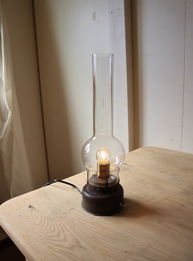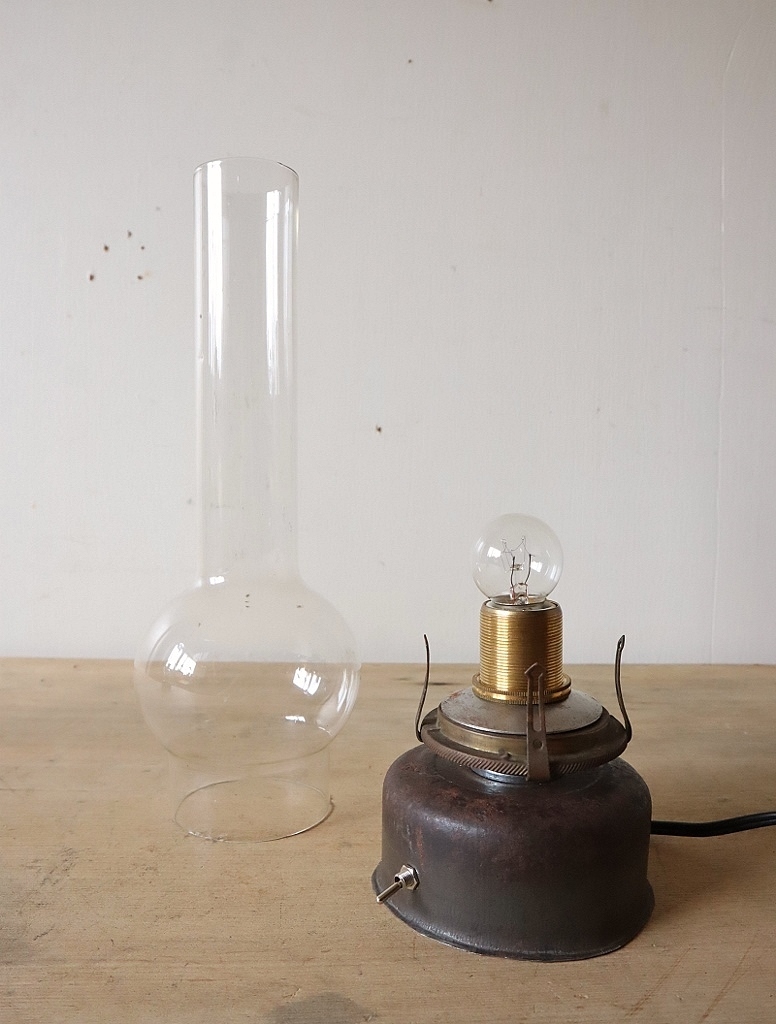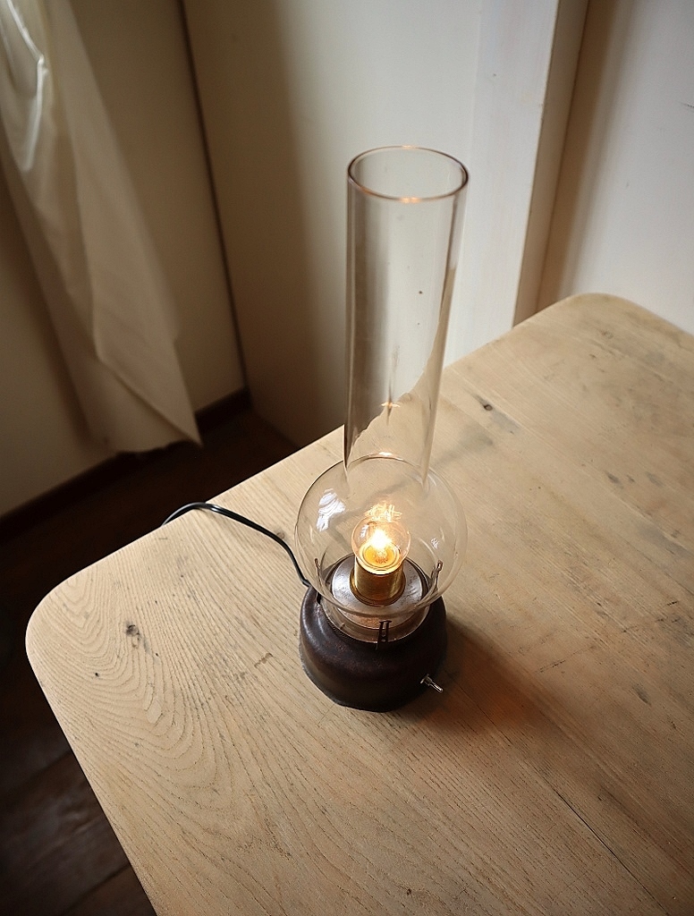 古いホヤランプで使われていたオイルタンクとガラスを留める部品、ホヤガラスにソケット、コード、スイッチを取り付けて電気仕様で使えるランプに改良しました。