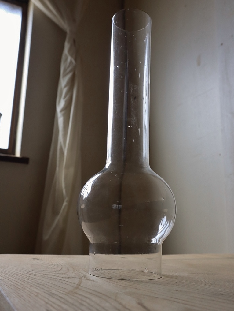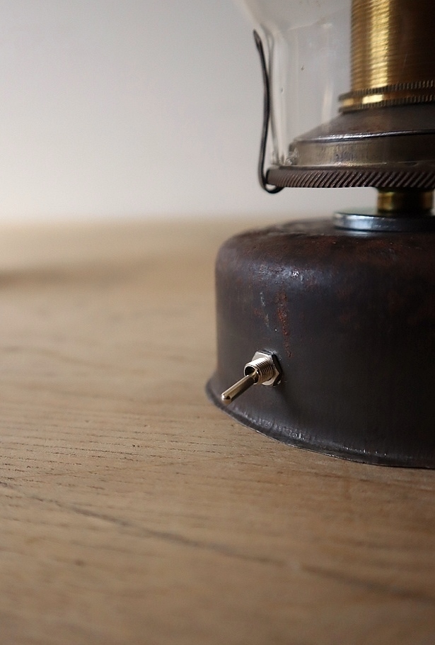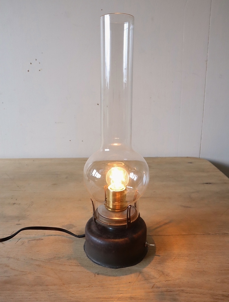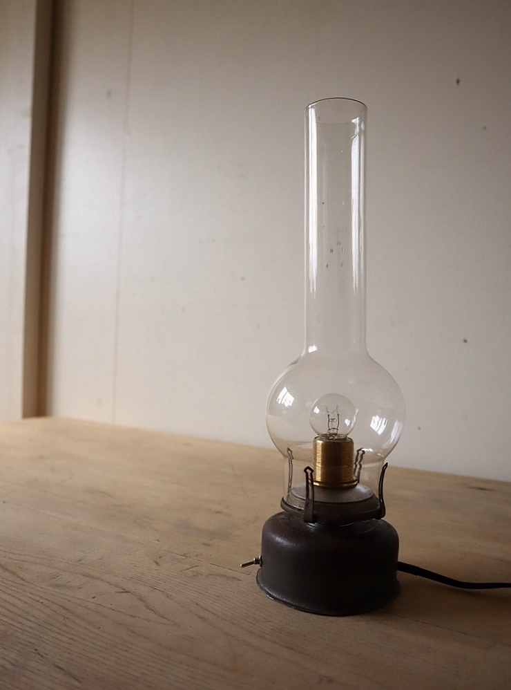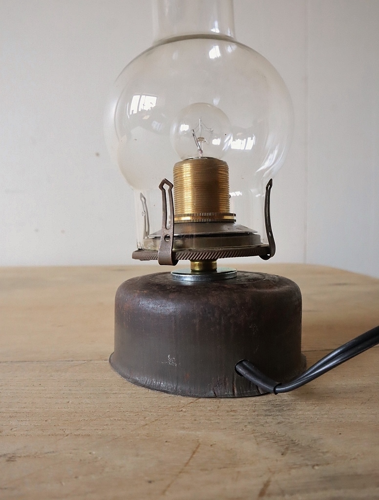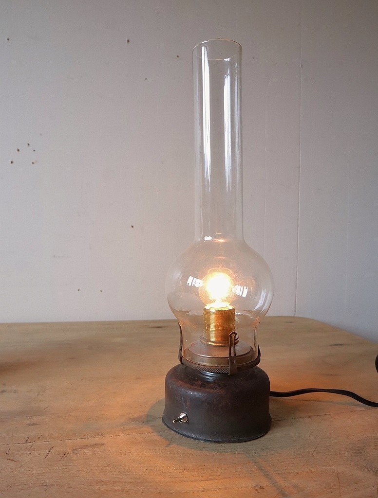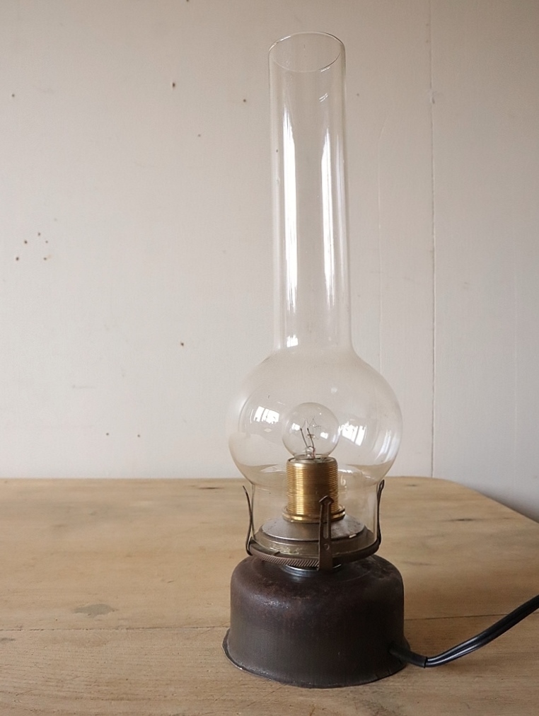 古いホヤランプで使われていたオイルタンクとガラスを留める部品、ホヤガラスにソケット、コード、スイッチを取り付けて電気仕様で使えるランプに改良しました。
