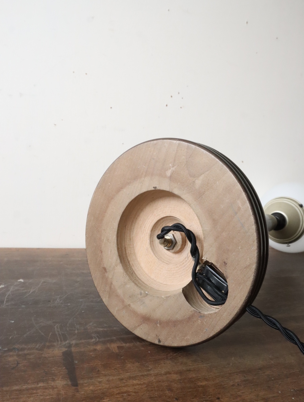 台座、ポールは木製、シェードホルダーはアルマイト製、ポールの真ん中の金具はスチール製になり、ソケットは白磁製です。