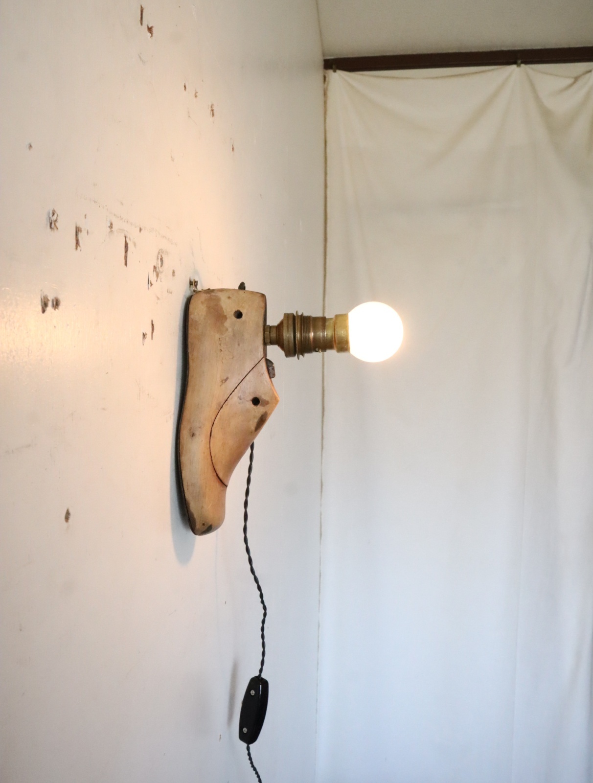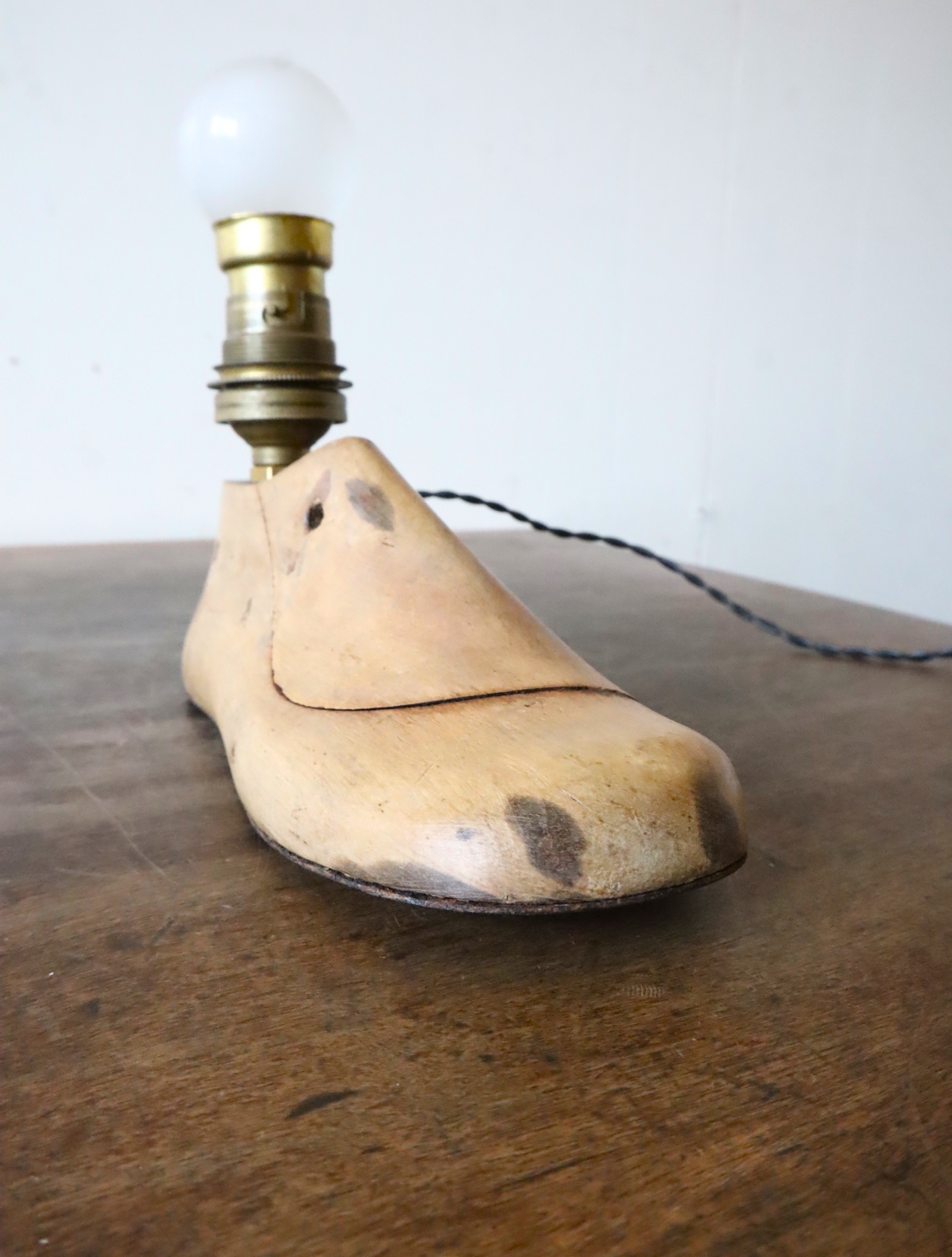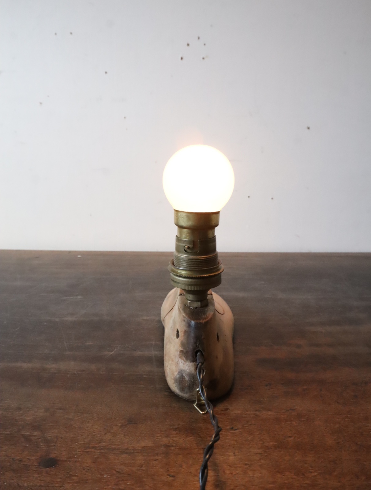 イギリス製の子供の靴の木型に真鍮製のソケットを組み合わせて仕立てたライトになります。