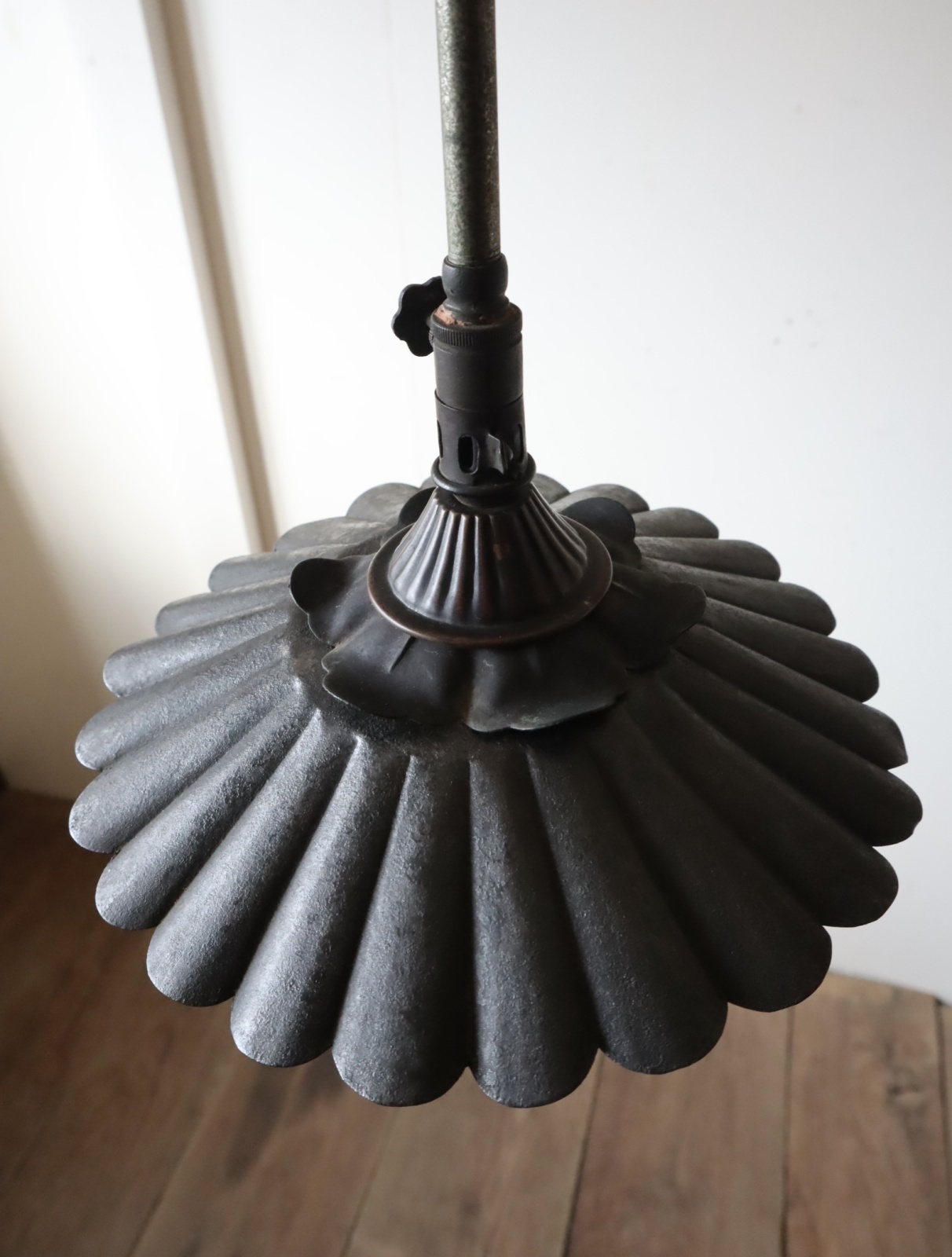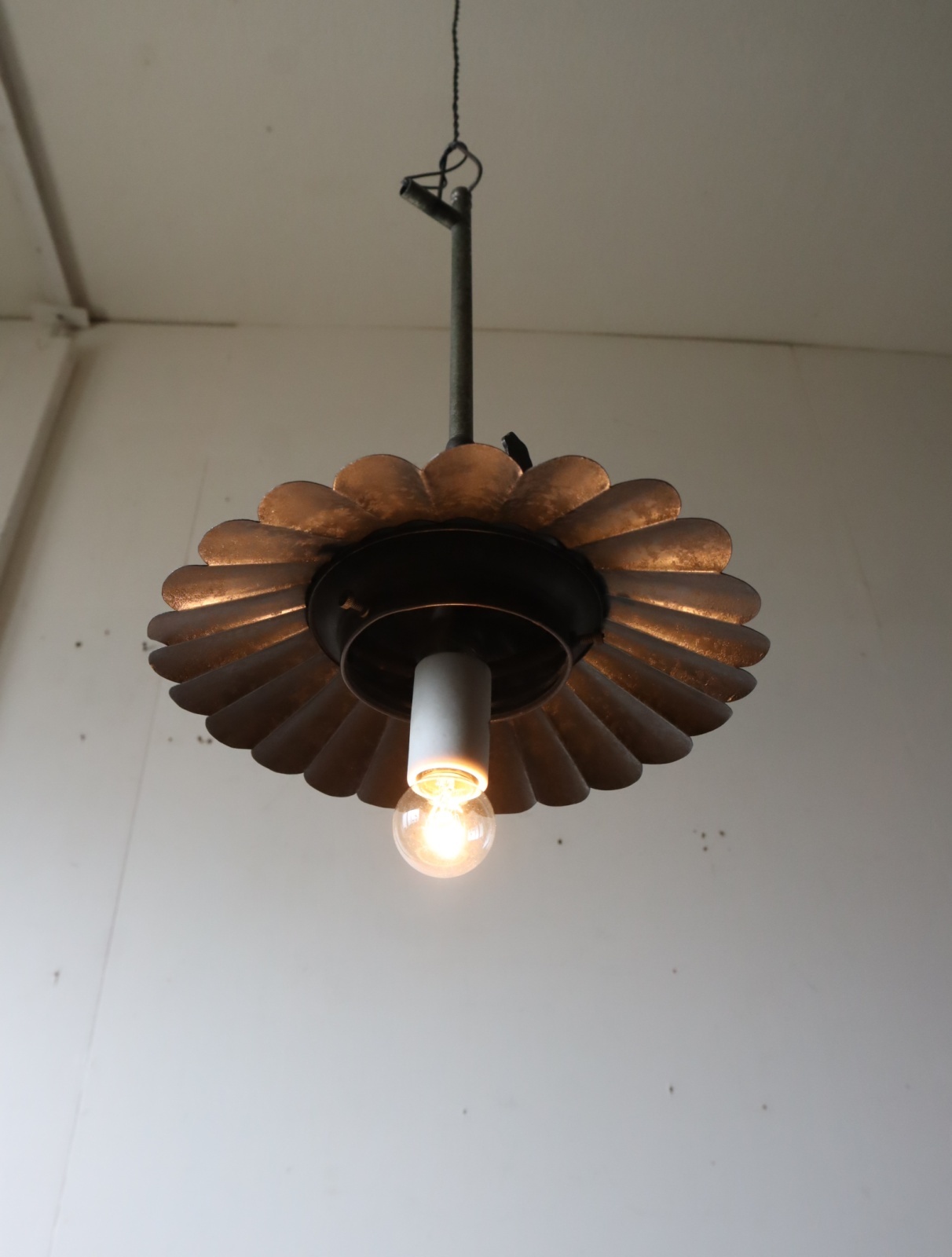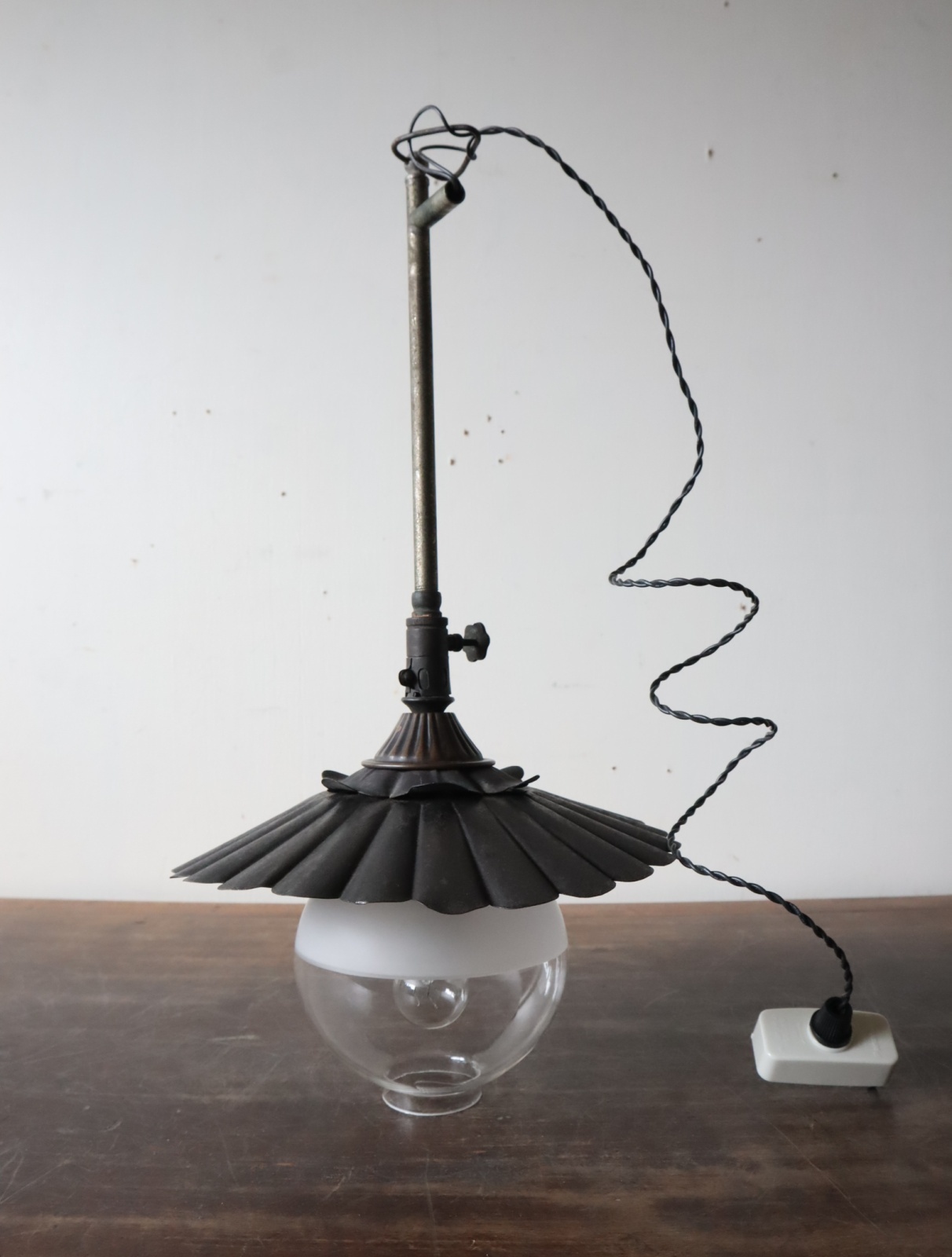 シェードが付いた吊り下げタイプのガス灯にソケットとコードを取り付けて電気仕様に作り替えました。
