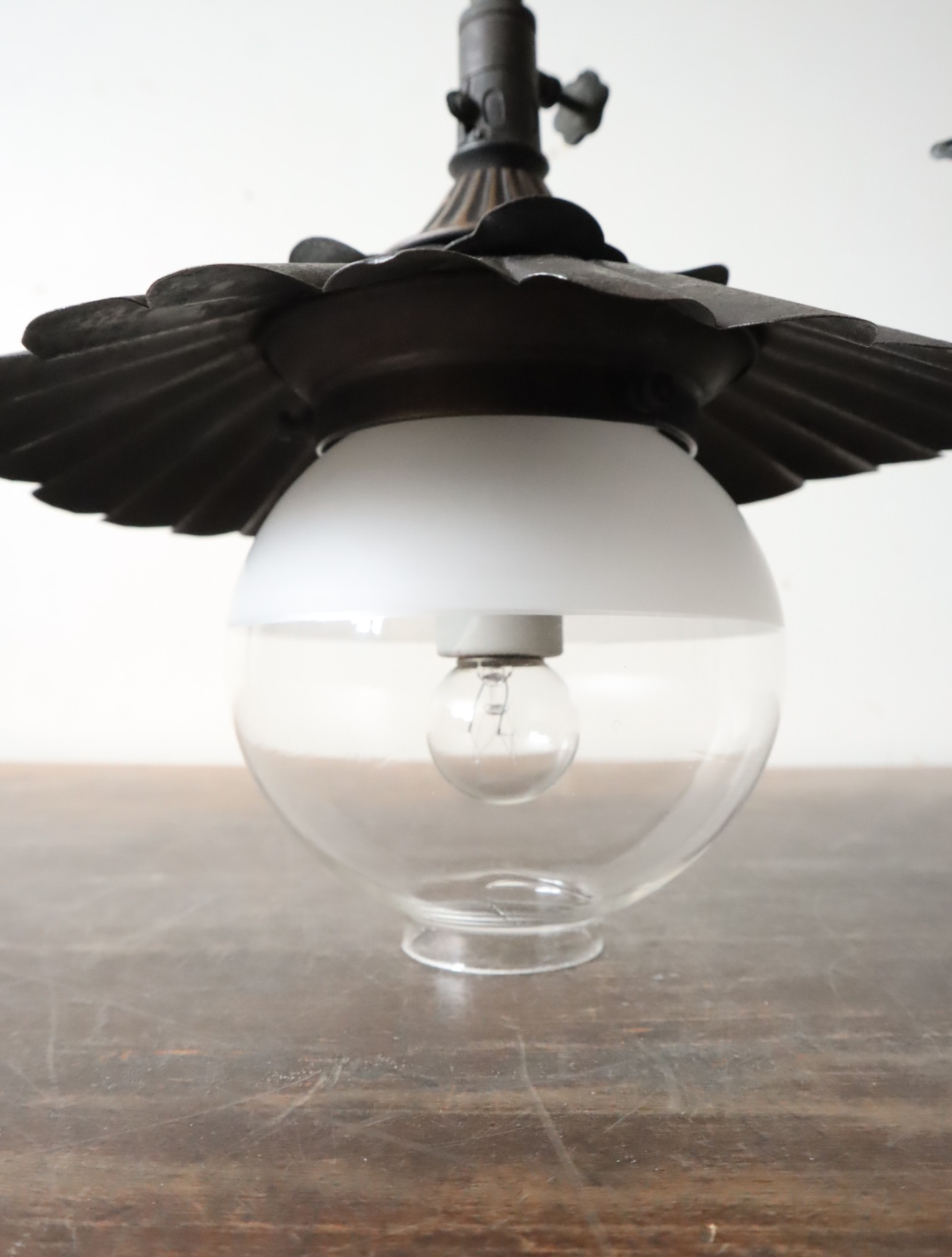 シェードはブリキ製、細かい部品は銅製、パイプ部は真鍮にメッキ加工が施されています。丸いカタチのホヤガラスは半分より上の部分が磨りガラス、下の部分はクリアガラスになっており、ガラスの揺らぎがあります。