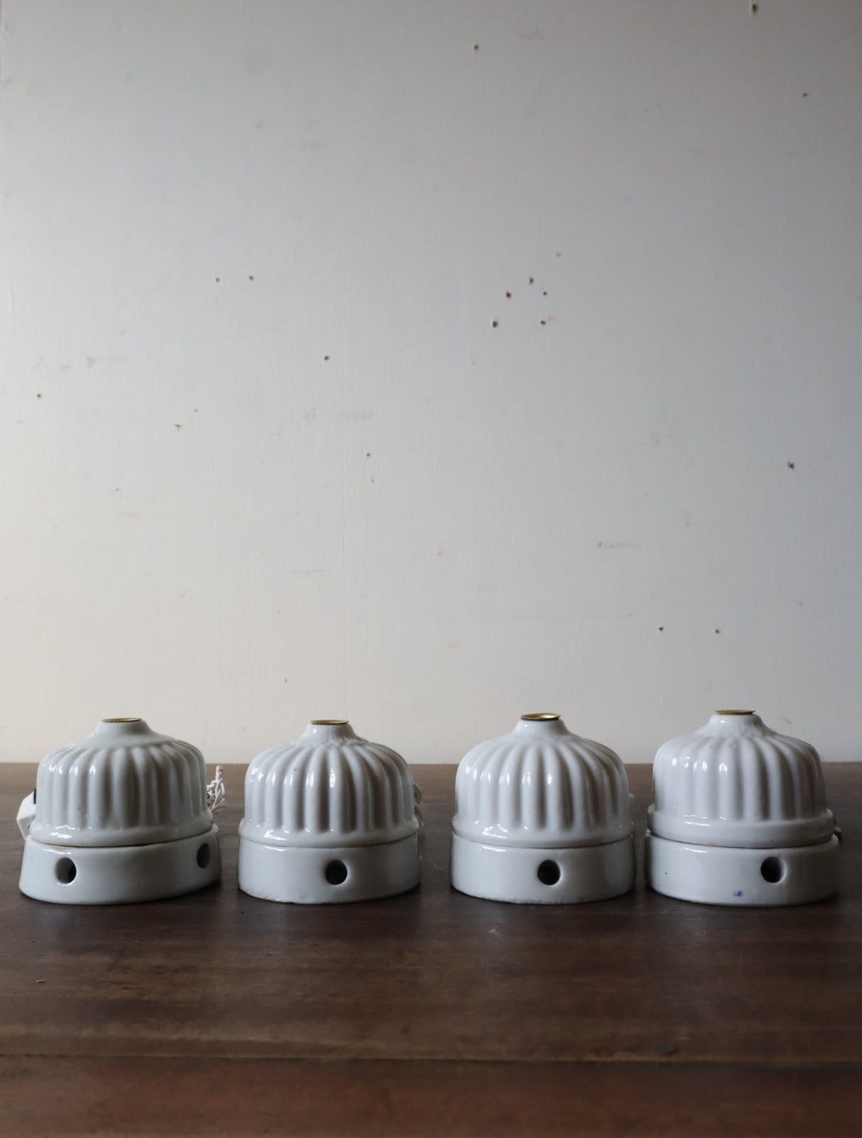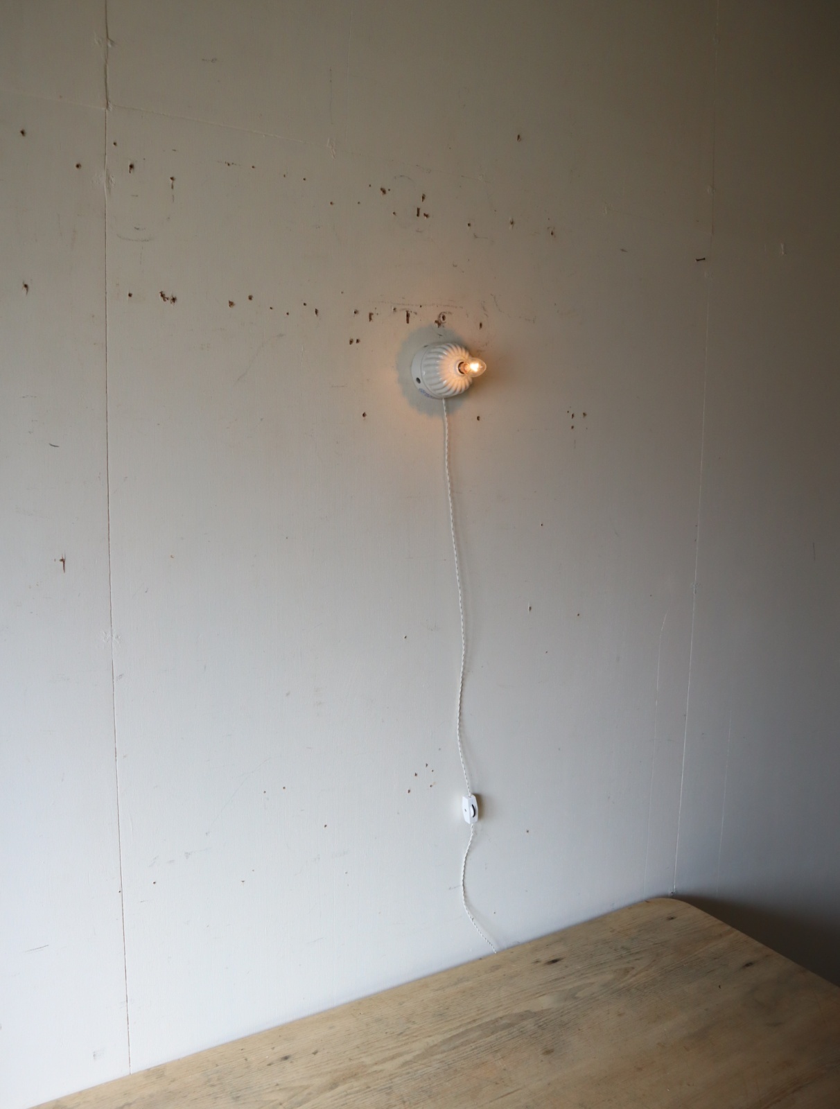 磁器製の古い菊型のローゼット(天井に取り付けて照明の配線を通すモノ)を使い、ソケットとコードとスイッチを取り付けて2wayライトに仕立てました。