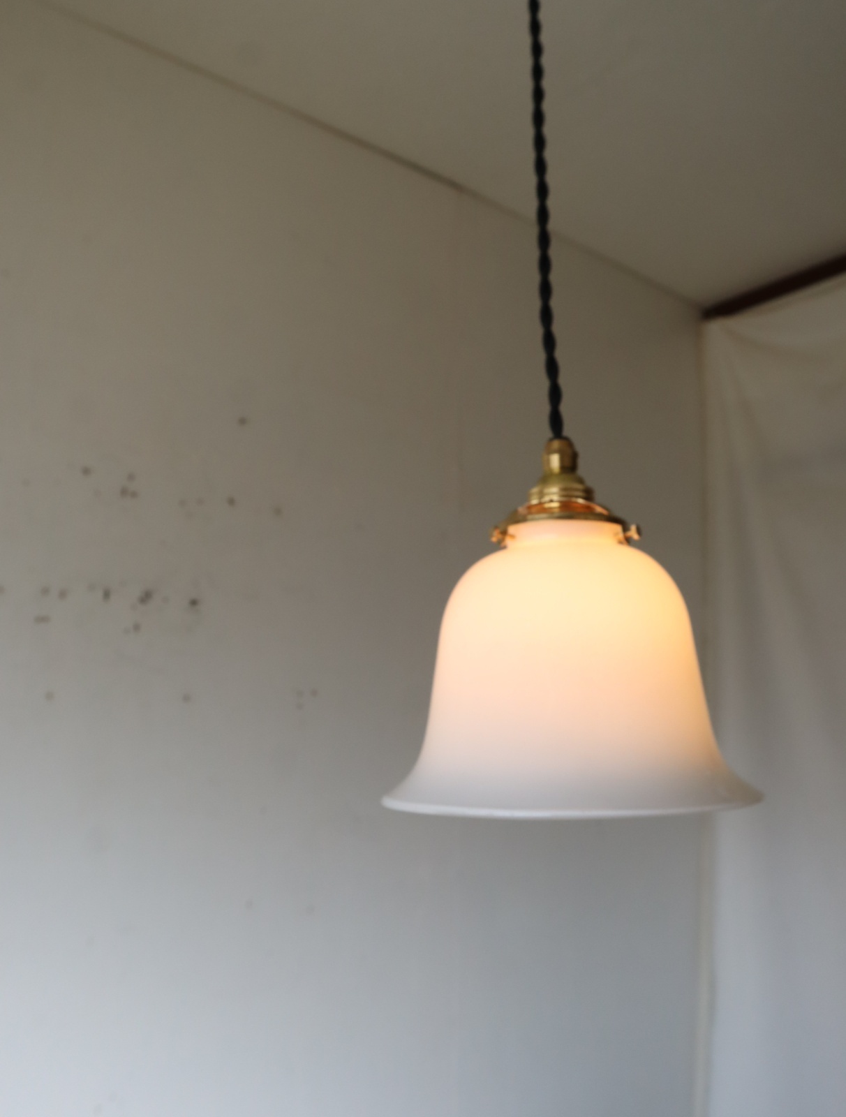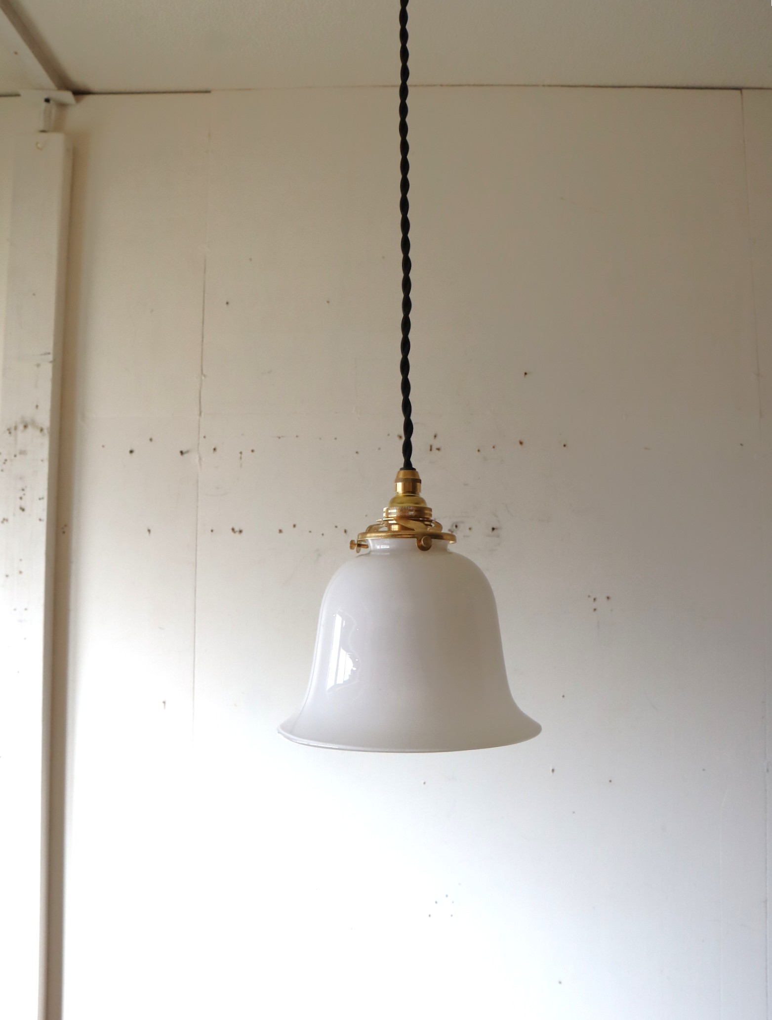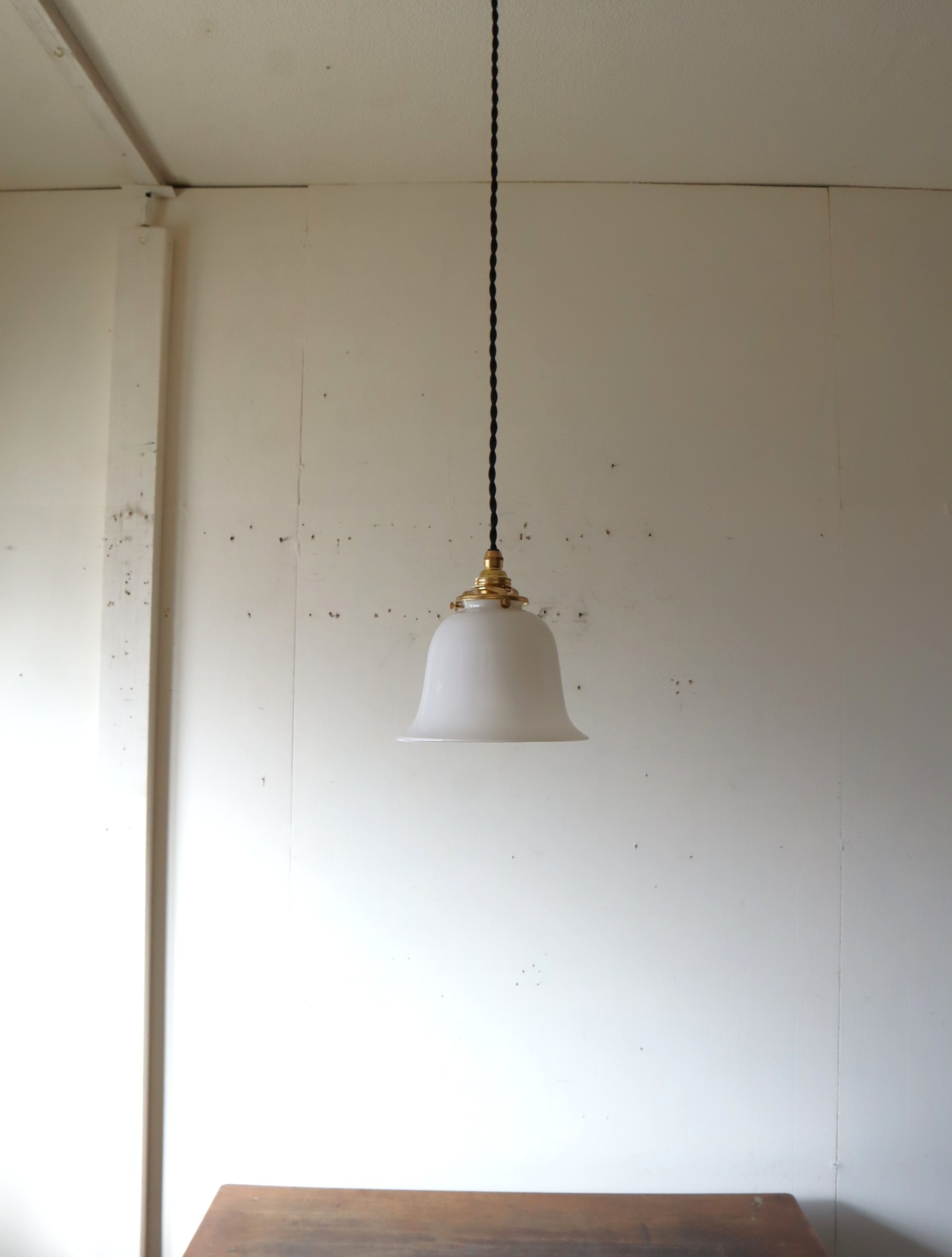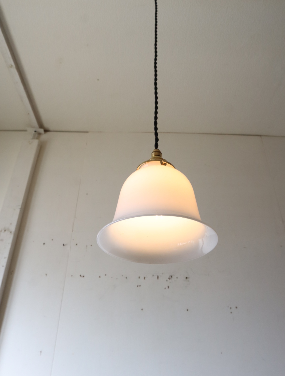 裾が広がったベル型の乳白ガラスのシェードを取り付けたペンダントライトになります。