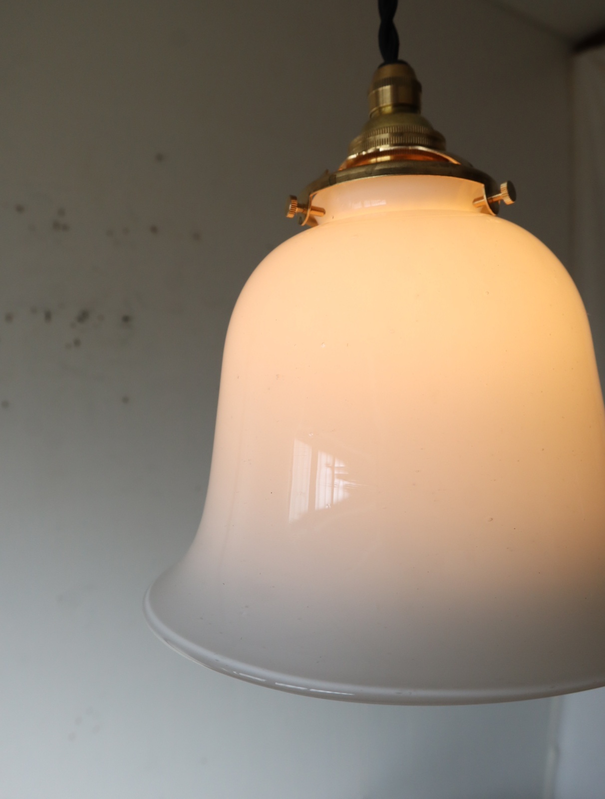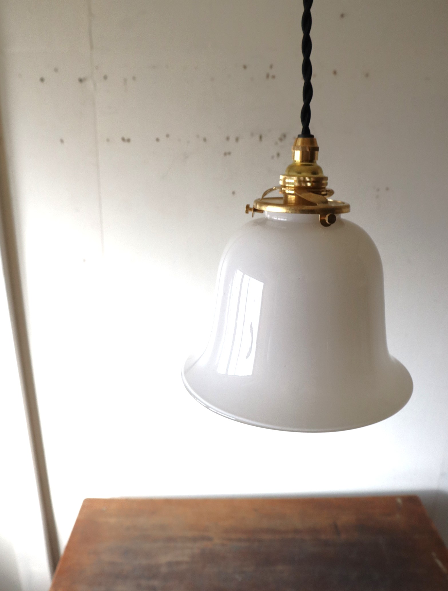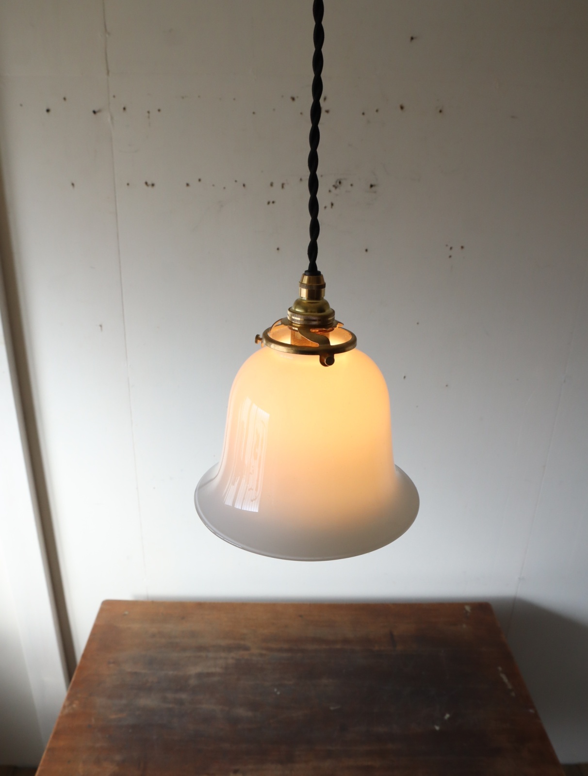 裾が広がったベル型の乳白ガラスのシェードを取り付けたペンダントライトになります。