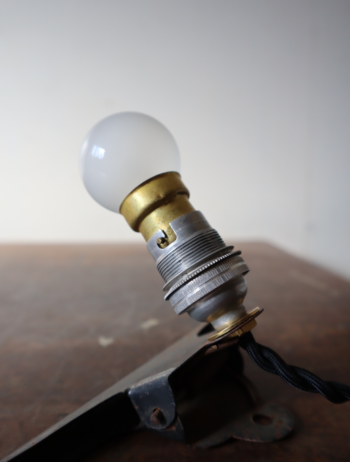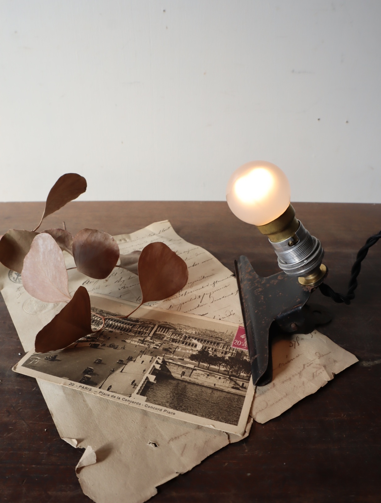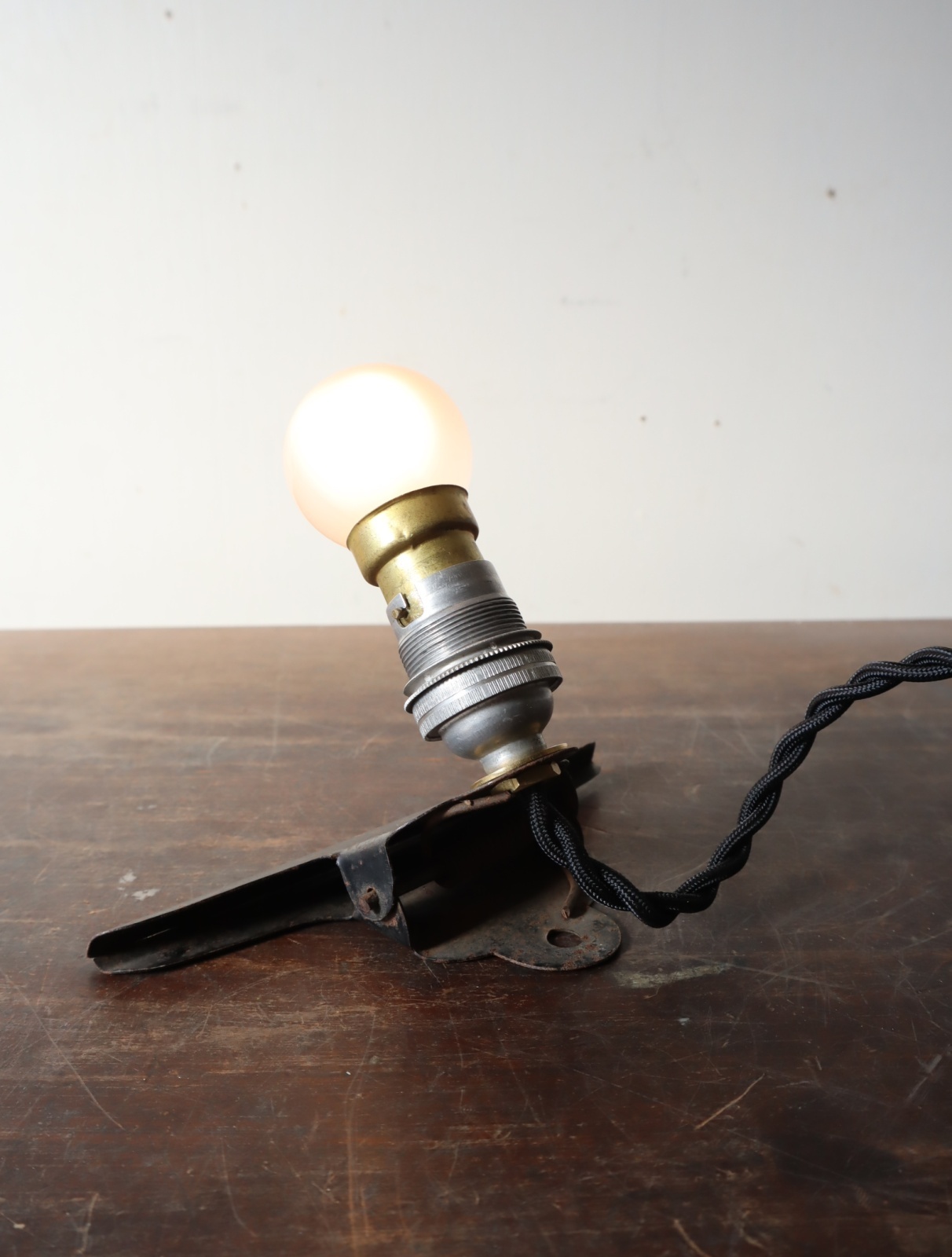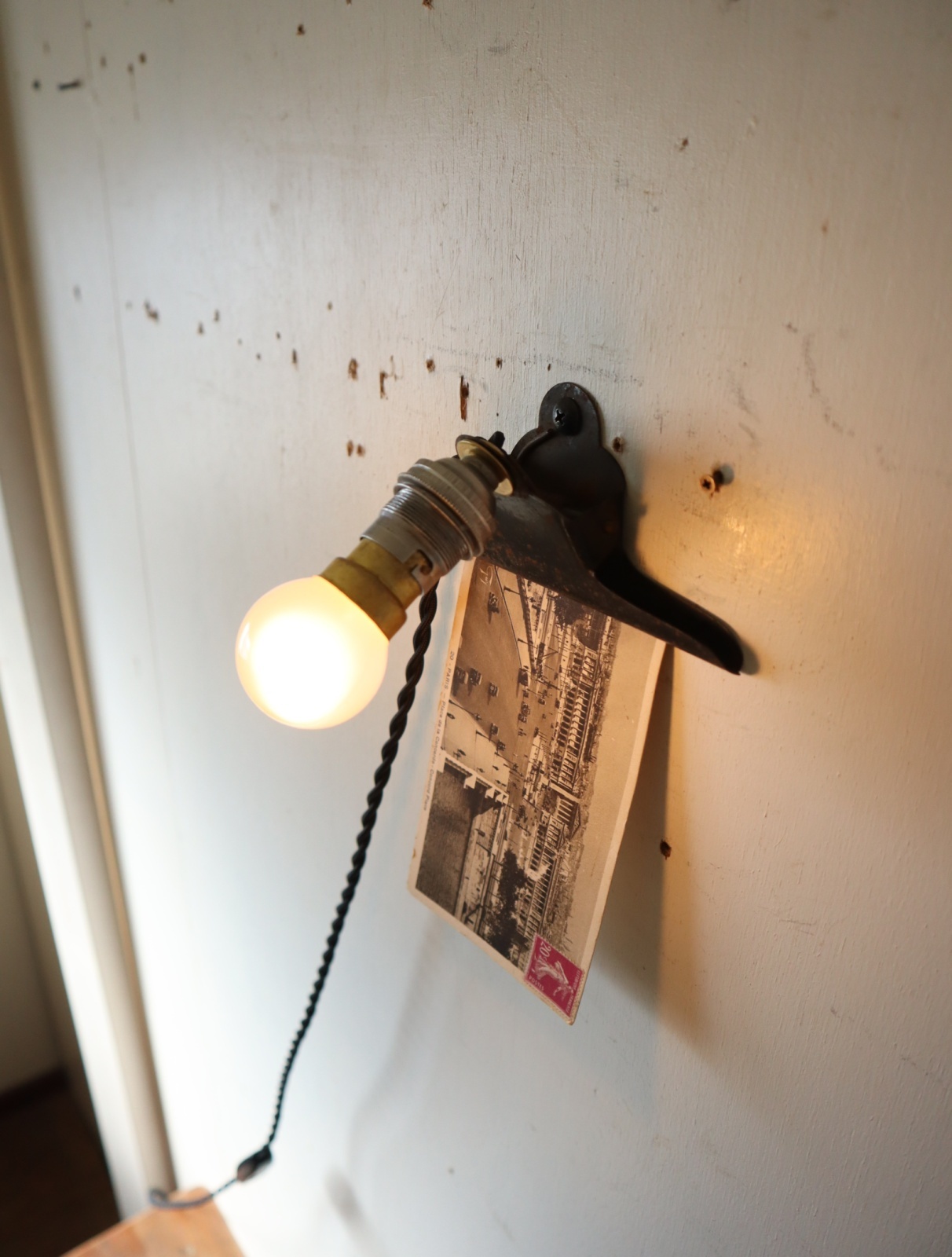 古いフランスのアルミ製ソケットと日本の古い黒色にペイントされたブリキ製のクリップを組み合わせた2wayライトになります。