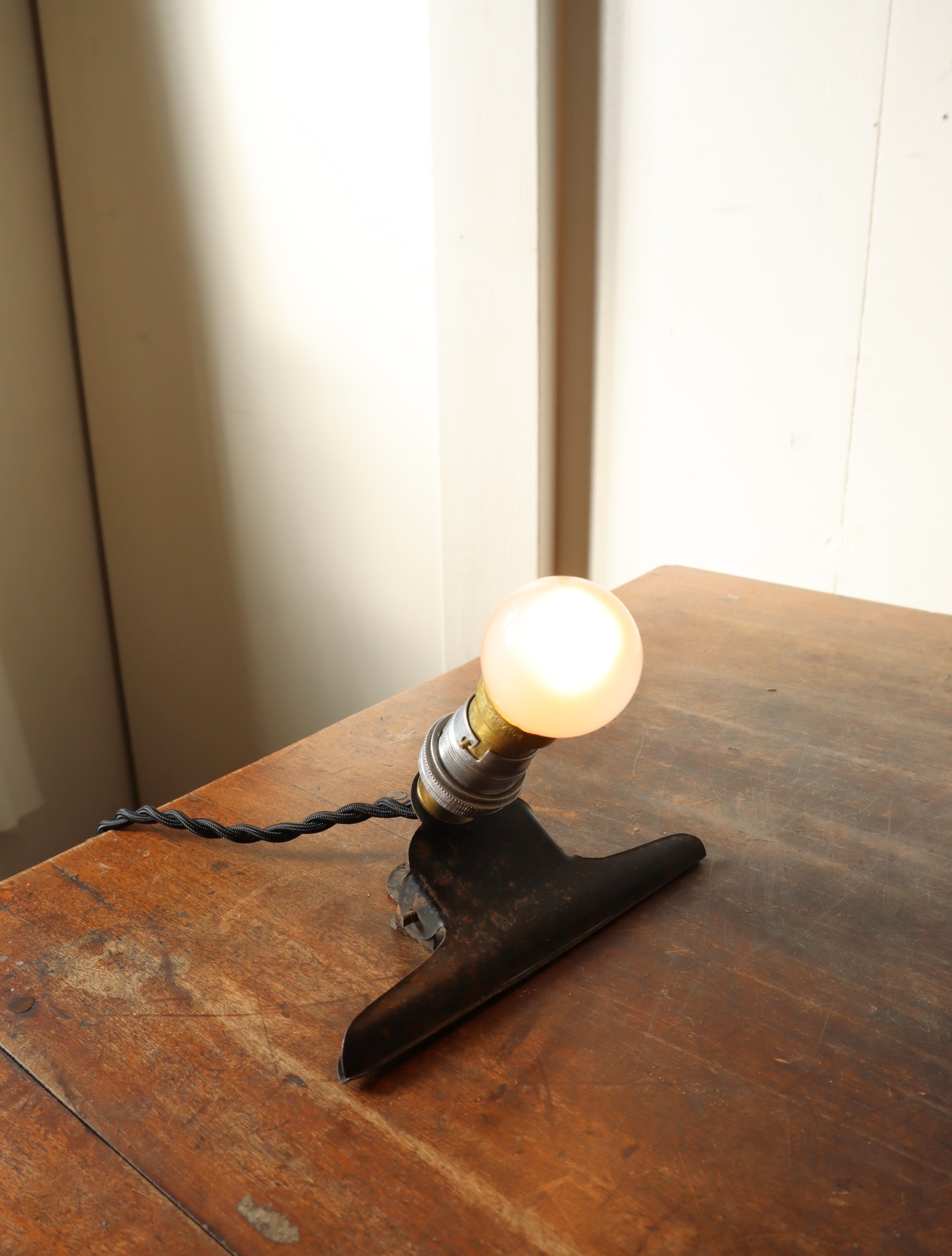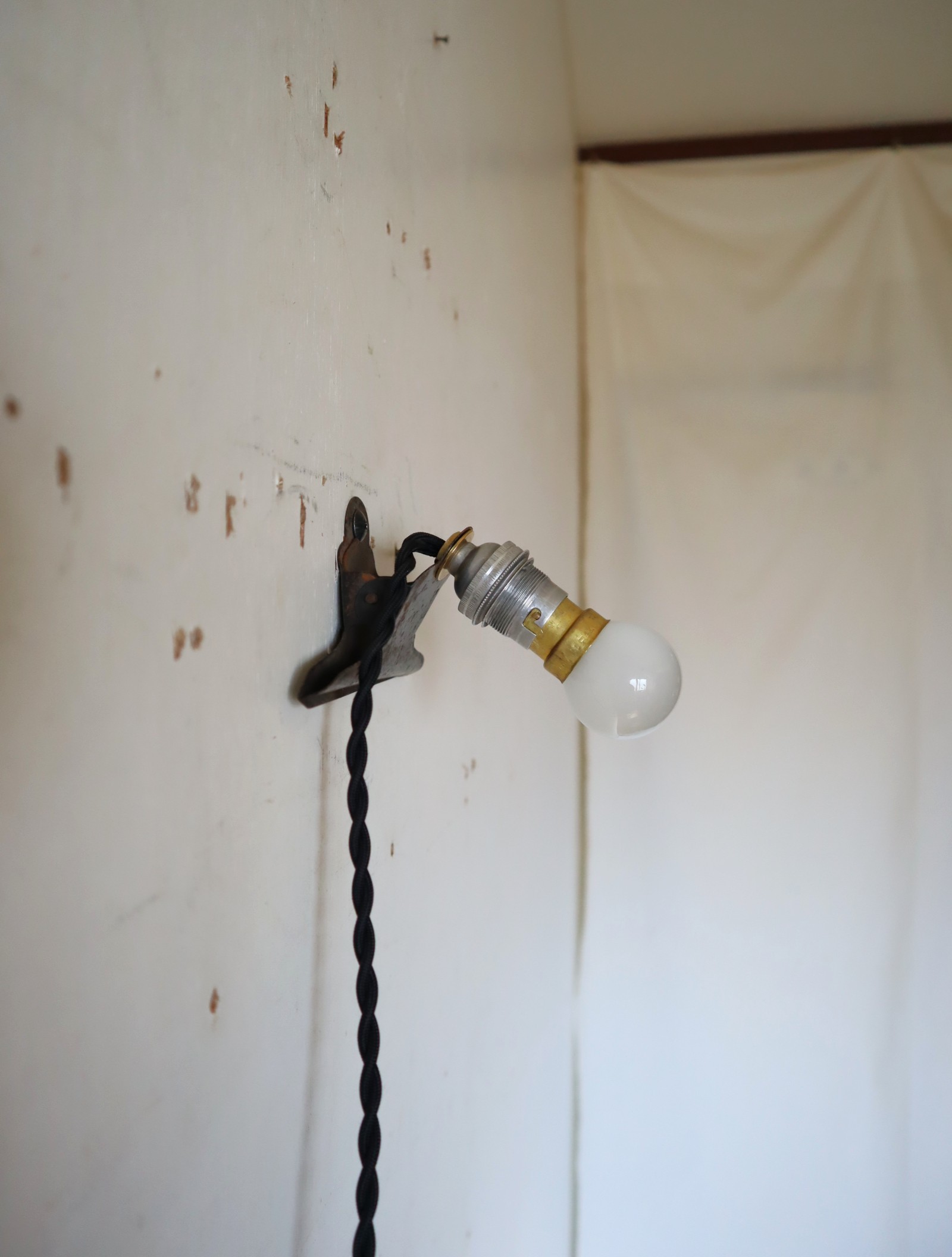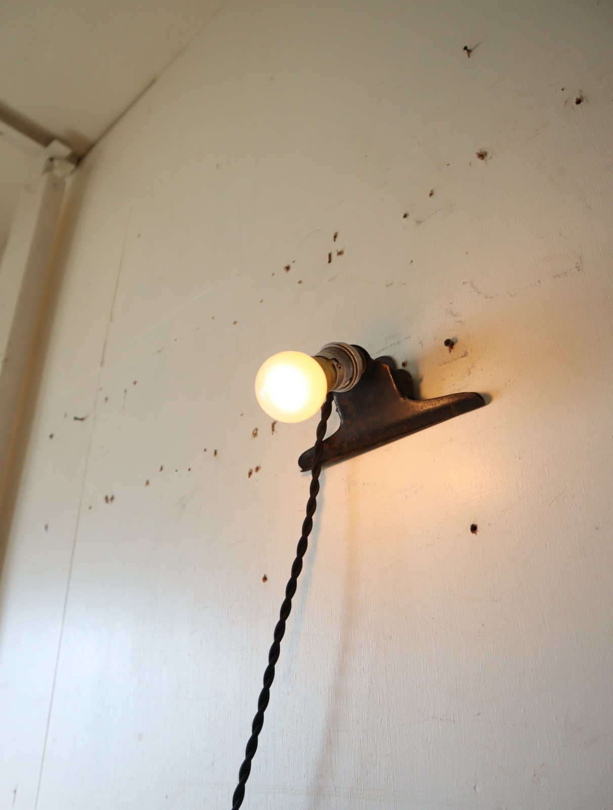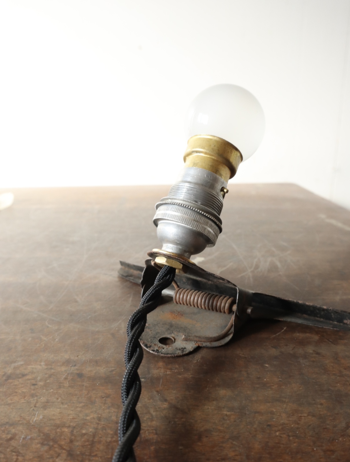 古いフランスのアルミ製ソケットと日本の古い黒色にペイントされたブリキ製のクリップを組み合わせた2wayライトになります。